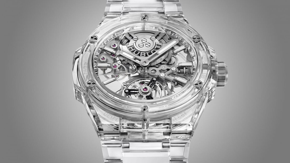 Бренд Hublot действительно является пионером в производстве материалов для часов. Девиз «Искусство слияния» превратился в призыв к действию. Последним шедевром из сапфира, который компания выращивает в лаборатории, являются часы Hublot Big Bang Integral Tourbillon Full Sapphire 455.JX.0120.JX на интегрированном браслете. Причем, новинка полностью состоит из прозрачного минерала. Иллюзорный корпус В корпусе и браслете, выполненных из сапфира, раскрываются секреты механизма, а детали видны, как на ладошке. Корпус Hublot Big Bang Integral Tourbillon Full Sapphire имеет диаметр 43 мм и толщину 15,25 мм. Он полностью реконструирован и теперь в нем размещен механизм с автоматическим турбийоном. Целью серьезных изменений было удаление почти всех видимых винтов, изменение общей геометрии корпуса, чтобы интегрировать его с сапфировым браслетом, модернизация мостов и основных пластин для максимальной прозрачности. Бренд позаботился о прозрачности и разработал маленькие вставки и насадки, которые