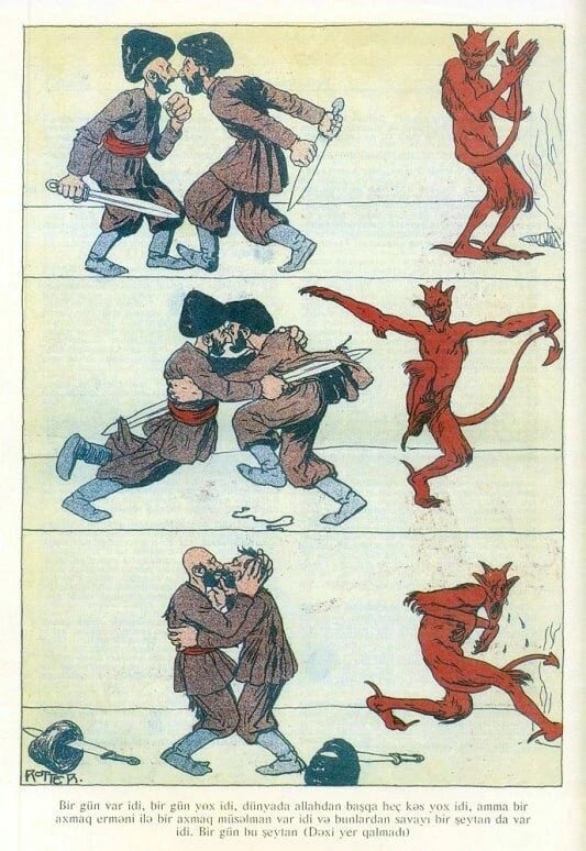 Вот вам карикатура, которая была впервые размещена в сатирическом журнале «Молла Насреддин». До революции он издавался в Тбилиси, а после нее переехал в Баку. Тут можно увидеть все: необычную рисовку, захватывающий сюжет с неожиданным окончанием, а также латинскую графику азербайджанского языка, которая была принята в 1920-е годы. Текст снизу переводится примерно так: «В один день подрались армянин и азербайджанец, так друг на друга похожие, и шайтан засмеялся. В другой день они помирились, шайтан заплакал и убежал». Действительно, представители этих народов одеты так, что отличить их непросто. Но знающие люди это сделают без проблем. Помимо того, что азербайджанец носит красный кушак (пояс из куска ткани), у него также лысая голова. Хотя в остальном одежда очень похожа. В те времена люди больше следовали обычаям, которые достались им от отцов и дедов. Давайте поэтому расскажем, почему у азербайджанца лысая голова. Нужно сказать, что этот азербайджанский журнал, который с перерывами из