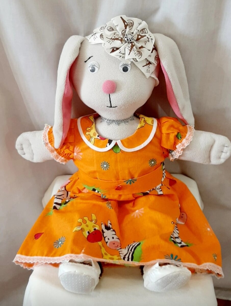 Накатило. Давно-давно шила я мягкие игрушки. Когда ребёнок был маленький. Все игрушки были сшиты мной, ни одной покупной. Он их обожал. Когда вырос, раздали их другим детям. И вот сейчас что-то нашло. Озарение, как волна накатила. Захотелось сшить такую Зайку. И родилась эта милашка. ХЭНДМЭЙД. ЗАЙКА в оранжевом платье из хлопка. Рост 60 см. Плюс набор одежды ( смотрите фото): комбинезон красный льняной, топ желтый с желтыми шортами , пинетки, носочки, оранжевые трусики хб под оранжевое платье, повязка трикотажная на голову с цветком,пижамка хлопковая для сна и гнездо для сна с ручками для переноски и подушкой и покрывалом( все из хлопка). Отличная интерьерная игрушка для взрослых и развивающая игрушка для детей от 4-5 лет. На одежде застежки, шнуровки, кнопки, пуговицы, молнии — все для развития мелкой моторики, а также это игрушка для сюжетно - ролевых игр.Пусть ребенок развивает свою фантазию . Игрушка выполнена в единственном экземпляре, но возможен повтор в другом наборе оде