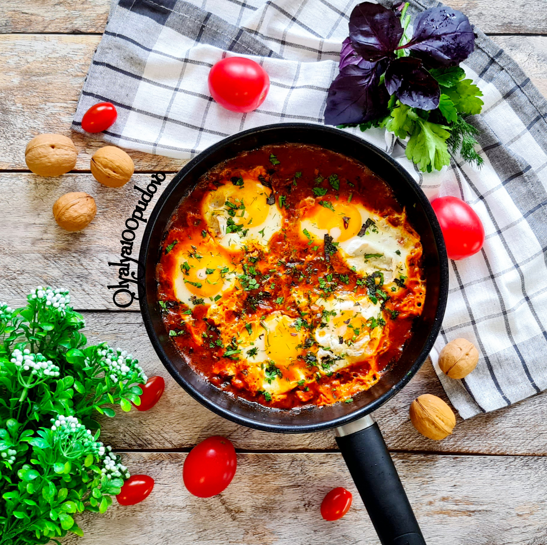 Традиционное блюдо грузинской кухни - Чирбули. Спелые помидоры, ароматные травы и специи, грецкие орехи. Невероятно вкусный соус и яйца в которые можно макать хлеб, лепёшку. Идеально! 👌 Своего рода, это яичница с помидорами, похожая на Шакшуку. Благодарю за вдохновение @annashifood 💐 Ингредиенты: яиц, луковица, грецких орехов, чеснока, средних помидора, кетчупа или 1 ст.л. томатной пасты, зелени, петрушка, укроп, базилик, сушёной кинзы (можно пару веточек свежей), соли или по вкусу, сахара, острого перца красного чили хлопьями, сушёного молотого кориандра, сливочного масла для жарки, Оливкового или растительного масла для жарки, воды, кипяток Способ приготовления: Для начала приготовим все ингредиенты. Режем кубиками лук и помидоры. Отдельно измельчаем каждый ингредиент. Чеснок, зелень и орехи. Разогреваем сковороду со сливочным и растительным маслом. Обжариваем лук до слегка золотистого цвета. Затем добавляем орехи, чеснок и кетчуп или томатную пасту. Жарим ещё пару минут, иногда по