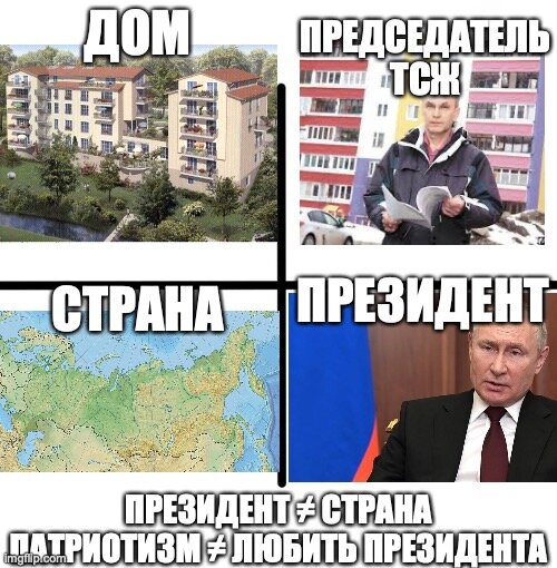Я часто вижу такую точку зрения: "Ты плохо говоришь про нашего президента, значит ты не любишь Родину. Ты предатель." Это очень вредный подход. С одной стороны у нас здоровый патриотизм: любовь к родному краю, к людям, к языку, к культуре. С другой – принуждение любить государственный аппарат с его председателем. И некоторые пытаются продать точку зрения, в которой любовь к Родине невозможна без любви к чинушке. Это, конечно, полная глупость. К примеру: У меня есть сосед. Он мне не нравится, потому что я считаю его бесчестным человеком да и просто мудаком. Он мне может не нравится? Конечно, может. Может он собаку пнул. Вообще это моё дело, кто мне не нравится. Теперь этот человек становится председателем ТСЖ моего дома. Я его должен любить? Нет, он же по-прежнему тот самый человек, который пнул собаку. И да – всё так же лишь человек, обычный гражданин. Он становится президентом. По странной логике теперь я его должен любить, потому что… что? Чем президент отличается от председателя ТС