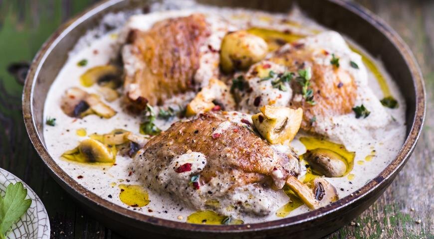 Чеснок раздавите и порубите, добавьте в сковороду вместе с букетом гарни. Поставьте сковороду на сильный огонь и обжаривайте курицу, пока кусочки не зарумянятся, примерно по 5 мин. с каждой стороны.