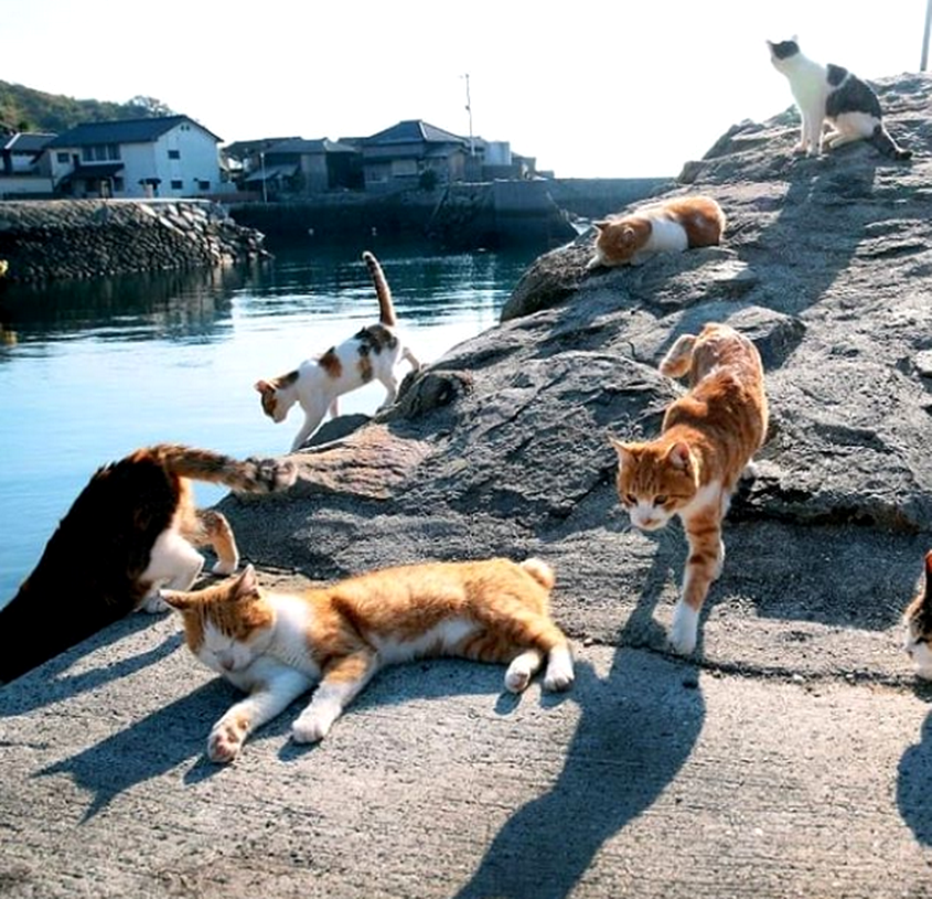 Аошима — «кошачий» остров. Крохотный остров, который имеет сообщение с «большой землей» посредством парома, курсирующего два раза в день. На острове проживают чуть более 20-человек, но зато кошек, хоть пруд пруди. Остров кишит усатыми-полосатыми, которые отлично себя там чувствуют. «Кошачий остров» Аошима. Соотношение котов к людям на острове составляет приблизительно — 10 котов на одного человека. Жизнь на острове размеренная, спокойная. Коты, которые составляют абсолютное большинство, людей не обижают, а воспринимают их, типа, как обслуживающий персонал. В добавок ко всему, на остров повадились приезжать туристы, как вы понимаете, вовсе не для того, чтобы посмотреть на людей. Котам везут всевозможные вкусности, от чего кошачья жизнь становится еще лучше. Чем не рай на земле? Когда-то Аошима был островом рыбаков. Кошек заводили рыбаки, чтобы бороться с мышами. Молодые люди постепенно покидали остров, старики умирали, кошки же, напротив, усиленно размножались и со временем заполонили в