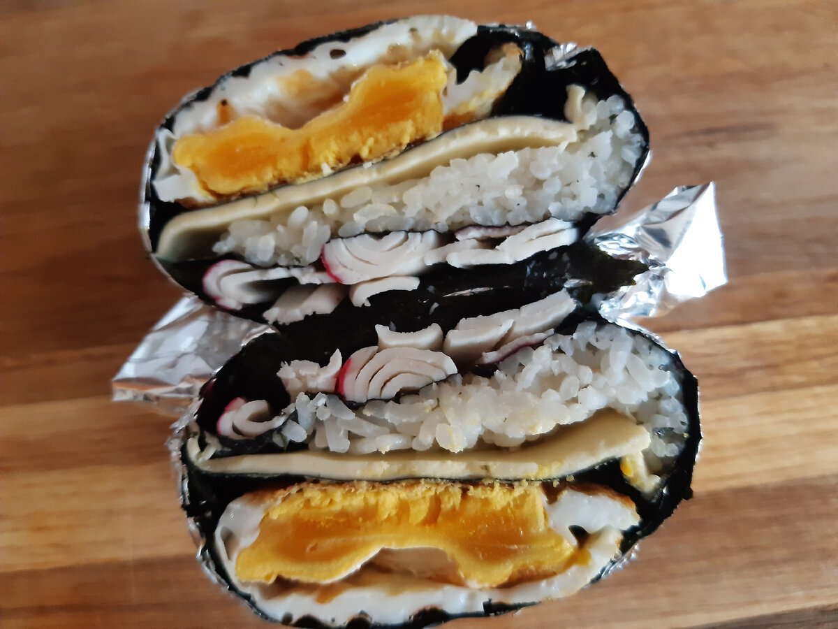 Суши-сэндвич, который стал хитом в дороге у нашей семьи. Совершенно гениальная штука! делается легко, вариаций - бесчисленное множество. Если любите суши-роллы - этот кимбап вам понравится ОЧЕНЬ! Его можно брать в дорогу, на работу как обед или перекус, в школу ребенку дать. Готовится очень быстро. Самое главное - вам понадобятся вородосли нори, вареный рис. А начинки могут быть любыми по вашему желанию. Я брала плавленый тостовый сыр, яичницу, крабовые палочки. Можно использовать филе курицы, тунец, огурцы, корейскую морковь и много всякого другого. Рис варим заранее как на суши, чтобы был клейкий. Я беру обычный круглый рис и добавляю примерно на 1 ст риса - 1+3/4 ст воды. В горячий рис добавляю чуть рисового уксуса, щепотку сахара и соль. Я подготовила все составляющие с вечера: сварила рис, нарезала крабовые палочки. Утром уже перед отъездом собирала кимбапы. Все делается очень быстро. Лист нори надо разрезать так, как показано на фото - т.е. по одной стороне прорезать до с
