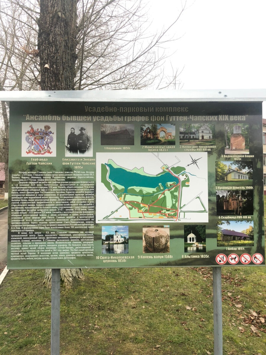 Усадебно-парковый комплекс графов Чапских — памятник архитектуры и садово-паркового искусства второй половины XIX века. Расположен в деревне Станьково Дзержинского района на равнинном рельефе (прямоугольный участок около 15 га) со склоном в сторону искусственного водоема, который ограничивает его с юга. С запада граница проходит по главной улице деревни. Включал дворец, флигель, два жилых дома, хозяйственные постройки, усадебный парк. Сохранились здание флигеля, так называемого «скарбца», жилой дом, восточные ворота, беседки, некоторые хозяйственные постройки. Парк заложен в 1870-ые годы в усадьбе графа Э. Гуттен-Чапского, комплекс формировался до начала XIX века. Господский дом Править Дворец — одноэтажное П-образное в плане здание с двухъярусной башней. Был построен в 1880 году в романтическом стиле с использованием форм средневековой архитектуры. Второй ярус башни имел четыре балкона, откуда открывалась круговая парковая панорама. Подземными переходами-коридорами дворец был связ
