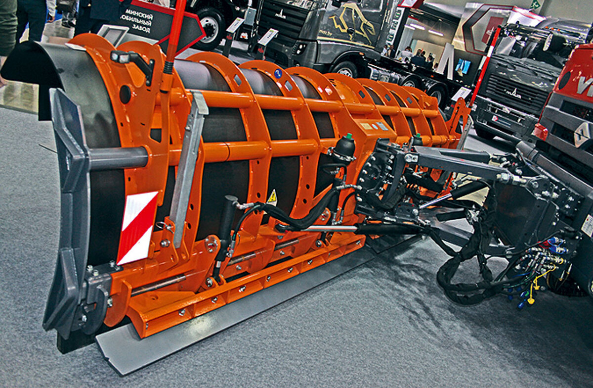 Достаточно тяжелое шасси «Урал-С35510» позволяет КДМ расчищать дорогу одновременно двумя отвалами. Впрочем, боковой можно задействовать и при поднятом фронтальном, если нужно расчистить только обочину. Оба отвала рассчитаны на работу со скоростью до 60 км/ч, а коническая форма крыла бокового (серии АК) позволяет перебрасывать снег через отбойник за пределы дороги. Ножи здесь тоже из стали Hardox‑400. Защита от столкновений (учитывая, что видимость сбоку у водителя гораздо хуже, чем спереди, а под снегом на обочине запросто может лежать, например, бетонный блок) дополнена срезным болтом в заднем креплении, то есть одноразовым сменным элементом пассивной безопасности.
