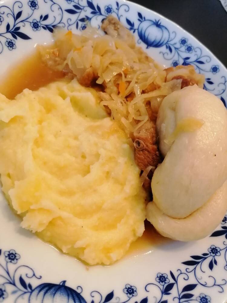 #традиции #Eggebek #Эггебек Это из старой семейной копилки. Его готовили в каждой семье российских немцев от Поволжья до Азии. Но в каждой семье по разному, по своему. Но и на севере Германии это блюдо очень распространённое. Только готовят опять же немного по иному, квашеную капусту тушат на яблочном или ананасовом соке с добавлением бекона. Подают также с картофельным пюре и отдельно подают выдержанное в рассоле и слегка закопченное мясо свинины, это может быть вырезка спиная, из шеи, лопатки, рёбра или брюшина а так же копчёные мясные колбаски. Ингредиенты: средняя свиная рулька, средние луковицы, свежей белокочанной капусты (можно и не добавлять), квашеной капусты, Соль, перец, лавровый лист, Для пампушек, сухих дрожжей, молока тёплого, сахара, соли, Муки сколько возьмёт тесто Способ приготовления: Первым делом приготовим тесто для пампушек. Из выше стоящих ингредиентов замесить мягкое тесто укрыть и убрать в тёплое место для подхода. Теперь займёмся рулькой, мясо срезать с кости (