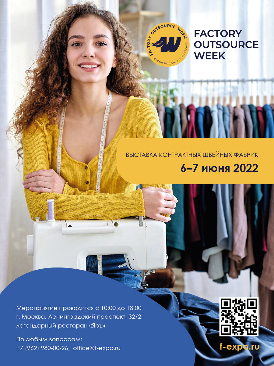 Приглашаем вас 6 и 7 июня 2022 года на третью выставку контрактных производств Factory Outsource Week. Всего за 2 дня выставки вы сможете: 👔 найти поставщиков и производителей; 👔 на одной площадке предприятия разной специализации, разных типов производств и географии готовые к заключению контрактов на производство; 👔 провести переговоры в короткие сроки 👔 узнать всё о новинках отрасли, новых технологиях и решениях. Также в новом сезоне на Factory Outsource Week будет представлена готовая продукция швейных предприятий. Узнать подробности и получить бесплатный билет на выставку - вы можете перейдя по ссылке: https://f-expo.ru