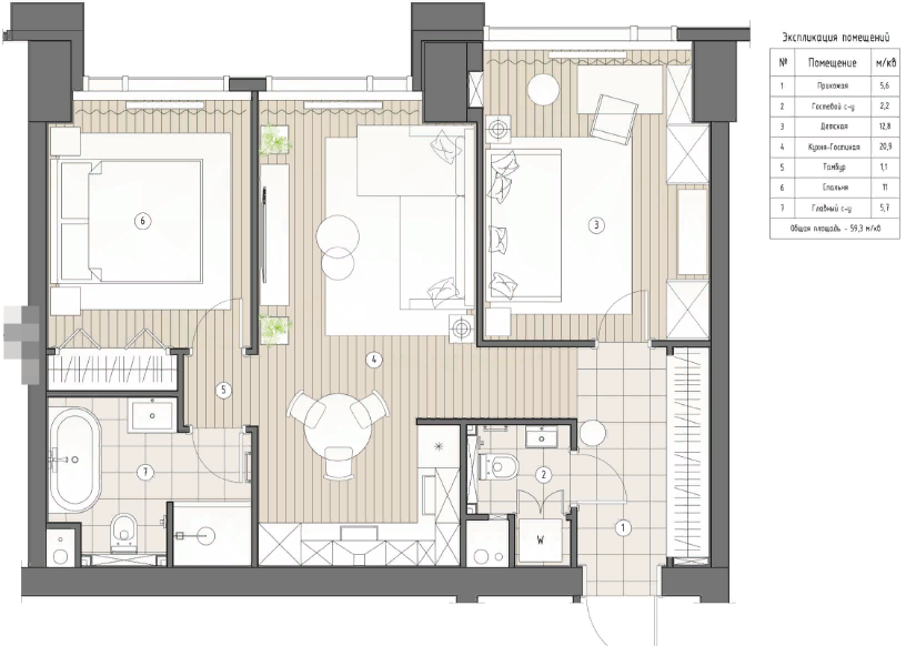 Новая квартира была приобретена молодой женщиной, где они будут жить с дочкой 5-лет. На момент покупки это была "бетонная коробка" в новостройке со свободной планировкой. В квартиру были заведены все коммуникации, на полу выложены блоки в виде обозначения границы предполагаемых стен. В принципе новую владелицу жилья планировка устраивала, единственное она попросила архитектора Андрея Некрасова, который занимался разработкой дизайн-проекта и оформлением интерьера, немного увеличить площадь гостиной и главного санузла. После того, как были возведены все перегородки, выполнили полную разводку электрики и других коммуникаций в квартире. Затем выровняли стены и потолки, которые позже покрасили. На пол залили стяжку, после полного высыхания в прихожей и санузлах положили плитку, в комнатах использовали штучный паркет в раскладке английская елка. Основной фон для общего интерьера выбрали в светлой цветовой гамме с добавлением ярких акцентов в виде мебели и текстиля. План квартиры после ремон