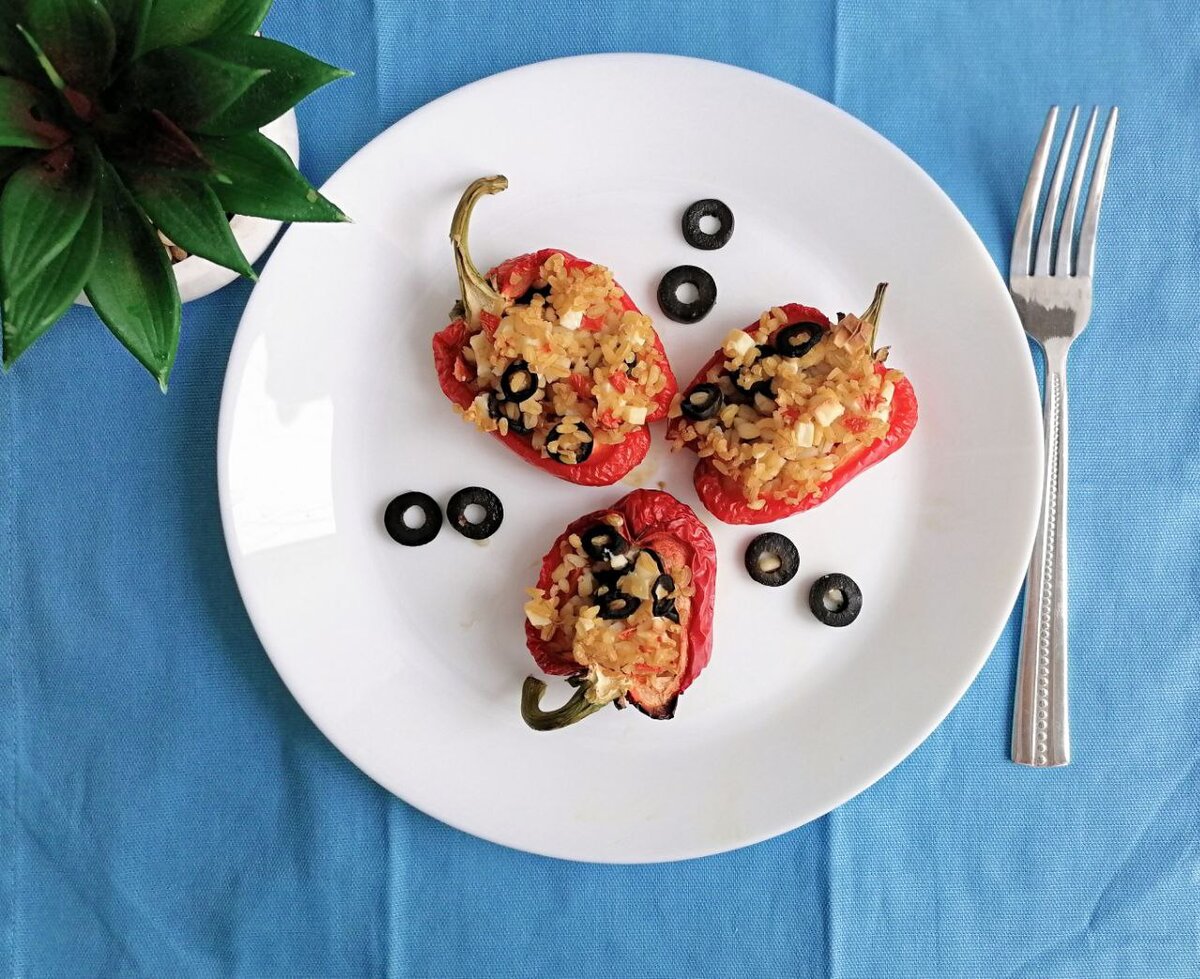 Запекать в духовке около 30 минут при 180 градусах. Я не советую оставлять это блюдо на потом. Лучше готовить и сразу съедать, пока теплые, так как после того, как булгур немного "полежит", он засыхает и становится очень твердым. Ингредиенты 2 болгарских перца 3 ст. л. булгура (может быть больше, в зависимости от размера перцев) 1 помидор 50 г фетаксы 1/2 банки маслин по вкусу соль и перец #перцы #фаршированные перцы #кулинария еда рецепты #еда и рецепты