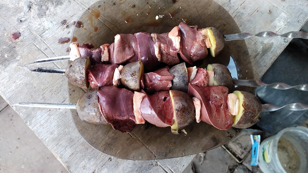 Всем привет! ☀️☕ Сегодня делюсь идеей простого блюда на мангале! На костре мы готовим очень часто. Нам это удобно. Хвороста после обрезки сада много. Да и быстрее, чем на электроплите. ( газа у нас нету). В эти выходные, специально за продуктами не ездили. Решили освобождать морозилку, под поездку на следующие , на фуд сити. Из того, что было решили готовить шашлык из печени. Её у нас всегда много. Делаем из неё паштеты и рулеты. Иногда, даже простото отвариваем.Поделитесь своими рецептами из печени! 👍Как вы её готовите? Так же в морозилке есть кусок сала. Картофель приготовили в мундире. Он очень долго готовится, поэтому перед мангалом, его нужно довести, хотя бы, до полуготовности. Сало и печень порезали порционными кусочками и залили соевым соусом. Самый простой маринад. Часто маринуем им рыбу и мясо. Картофель так же порезали. Не счищая кожуру. Насадили на шампура. По очереди. Печень, сало, картофель. Сало можно порезать покрупнее. Жарятся такие шашлычки минут 40. Получается ср