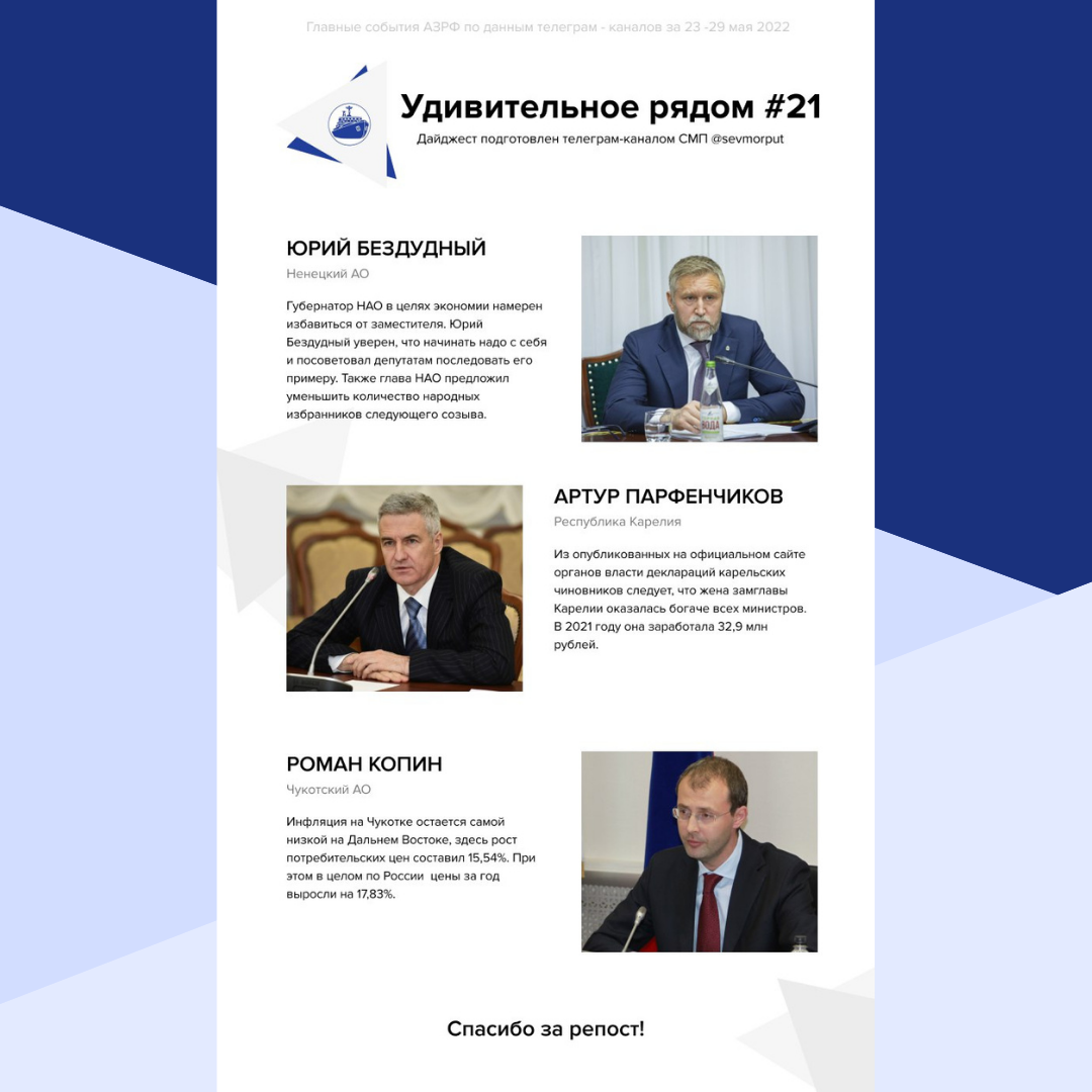 Представляем еженедельный рейтинг «Главы АЗРФ – Удивительное рядом. Неделя 21» Юрий Бездудный «Экономим на себе» Губернатор НАО в целях экономии намерен избавиться от заместителя. Юрий Бездудный уверен, что начинать надо с себя и посоветовал депутатам последовать его примеру. Также глава НАО предложил уменьшить количество депутатов следующего созыва. Почему Юрий Бездудный решил, что сокращение административно-управленческого аппарата органов государственной власти региона должно позитивно сказаться на эффективности работы правительства не ясно, но совершенно очевидно, на бюджет региона такой ход вряд ли окажет значительный эффект. Пока это больше похоже на популизм. Артур Парфенчиков «Бессребреники» Из опубликованных на официальном сайте органов власти деклараций карельских чиновников следует, что жена замглавы Карелии оказалась богаче всех министров. В 2021 году она заработала 32,9 млн рублей. При этом доход главы Карелии Артура Парфенчикова оказался почти втрое ниже супруги постпреда