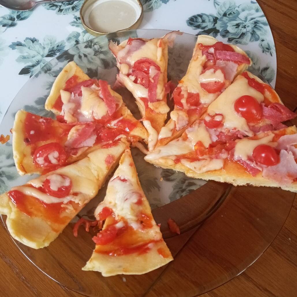 Вкусная пицца получаеться за 15 минут. Если мало времени и не знаете что сделать на обед, это блюдо очень подойдёт. Рекомендую попробовать!. Ингредиенты: Тесто, яйца, муки, сметаны, соли, Начинка по вкусу, Помидоры, Колбаска, Сыр, Кетчуп Способ приготовления: Разбить яйца Добавить соль Добавить сметану Добавить муку, перемешать и тесто готово Нарезаем то что хотите положить в пиццу, у меня это салями, шинка, помидоры черри Сыр натираем Начинка готова В сковородку наливаем не большое количество олии чтоб оно покрывало тонким слоем сковородку Разогреваем сначала на большом огне, а когда будем выкладывать тесто включаем на средний (5) Закрываем тесто под крышкой на 1-1,5 минут Переворачиваем, мажем кетчуп и кладём начинку Закрываем под крышкой пока сыр не расплавится Нарезаем пиццу на тарелку, разрезаем и готово Приятного аппетита!