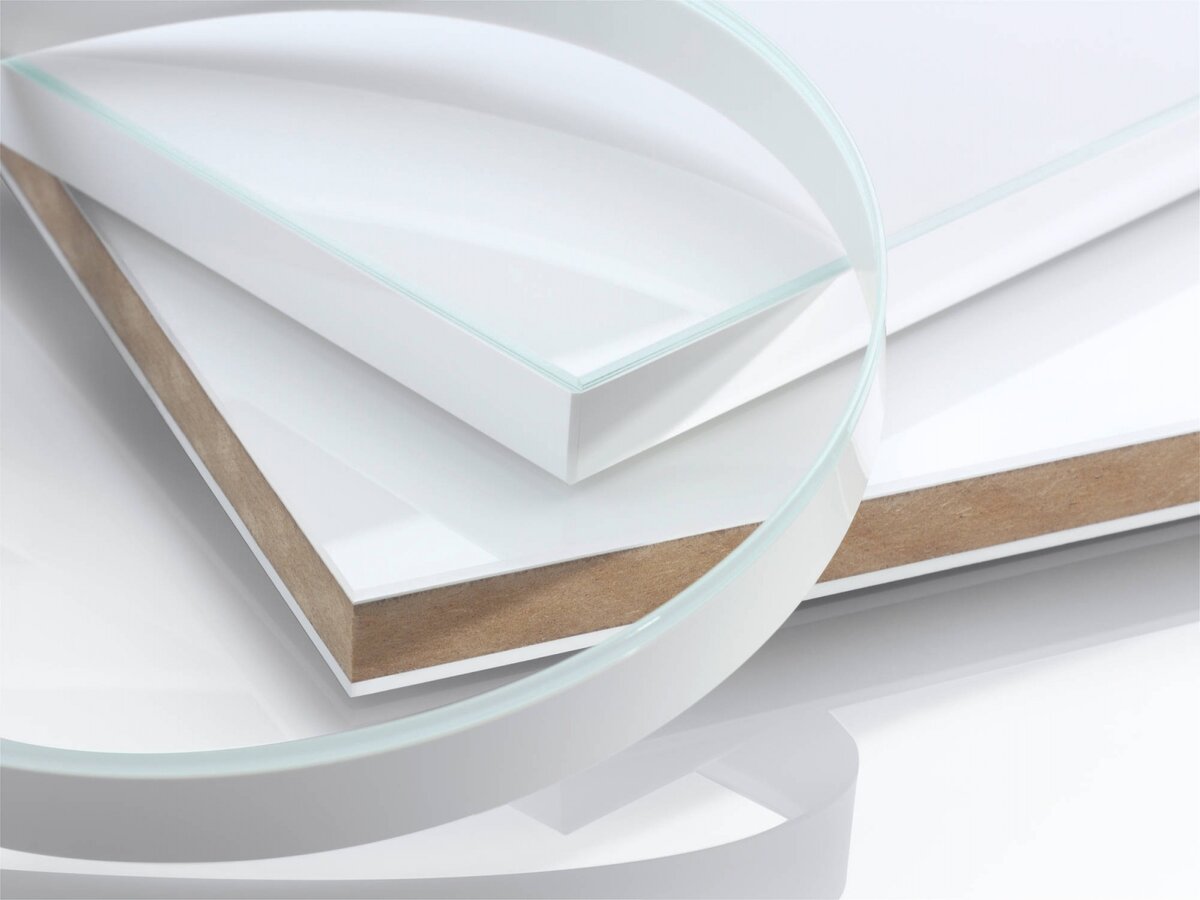 Всем привет! Продолжаем делиться полезной информацией. Сегодня разбираем материалы для фасада. а конкретнее, поговорим про стеклоламинат. Еще этот материал называют акриловое стекло. Но впрочем, как ни назови, материал очень даже интересный: Внешне напоминает стекло, но до 10 раз прочнее. И раза в 2 легче. Это ли не чудо современной инженерной мысли? Прежде, чем перейдем к преимуществам фасадов из этого материала, давайте остановимся на технологии изготовления, это важно. Стеклоламинат - это композиционный материал и состоит он из следующих компонентов: Основа материала: МДФ толщиной 16 мм. Облицовочный материал: полимерное стекло толщиной 2 мм. Обратная сторона: балансировочный лист толщиной 2 мм идеально подобранный в цвет фасада. Лазерная кромка имитирующая стекло в цвет фасадов. Таким образом мы получаем идеально гладкий фасад без кромок, рамок и прочих прелестей😬 Что касается преимуществ применения стеклоламината в производстве кухонной мебели: 🔆 не требуются специальные сре