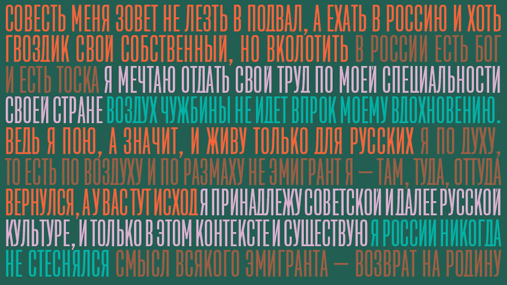 «Моя неудача в эмиграции — в том, что я не эмигрант, что я по духу, то есть по воздуху и по размаху — там, туда, оттуда…»