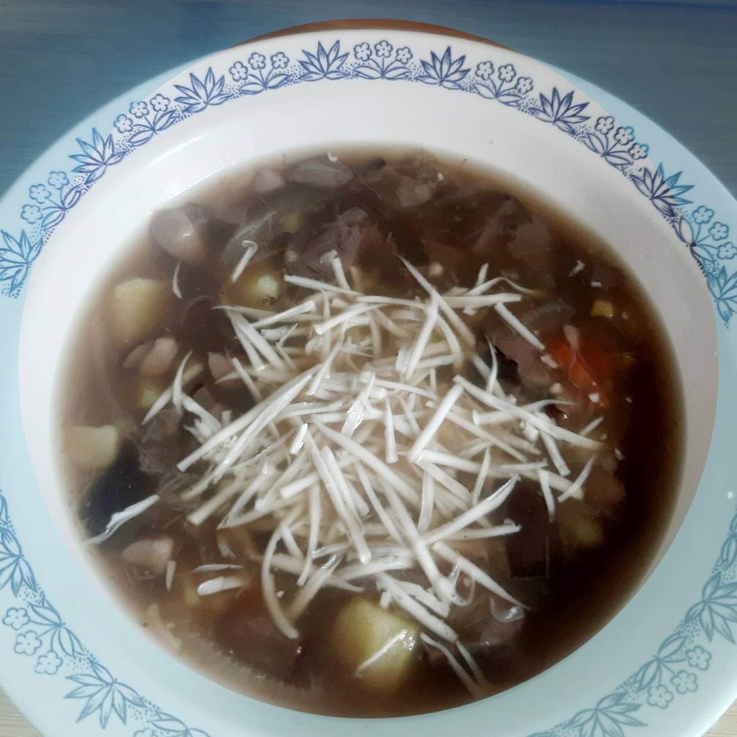 В кастрюле вскипятить воду и опустить нарезанные кубиками картофель. Через 5 минут добавить замороженный болгарский перец и продолжить варить. Посолить и добавить грибной бульонный кубик.