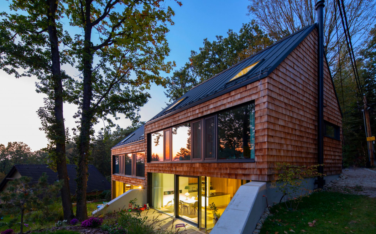Помните знаменитый диалог из фильма «Москва слезам не верит», где один из персонажей предлагает дружить домами? Героям нашей истории удалось претворить эту идею в жизнь. Два закадычных друга из Словакии давно хотели жить по соседству, проводить вместе свободное время и отдыхать семьями, а еще к каждому Рождеству вместе с детьми лепить в саду снеговиков. Чтобы воплотить мечту в реальность, они решили построить дуплекс. В коттеджном поселке, расположенном у подножия Малых Карпат (недалеко от Братиславы), был выбран участок. Он отличался довольно непростым рельефом, но приглашенным к работе архитекторам удалось виртуозно справиться со всеми сложностями. Проблема заключалась в том, что склон делил участок практически пополам. Из-за этого один из блоков авторы проекта предложили установить внизу, а второй — на вершине, объединив их общей стеной. В результате, если смотреть на дома с улицы, то виден только один этаж и двускатная остроконечная крыша. А вот со стороны внутреннего двора построй