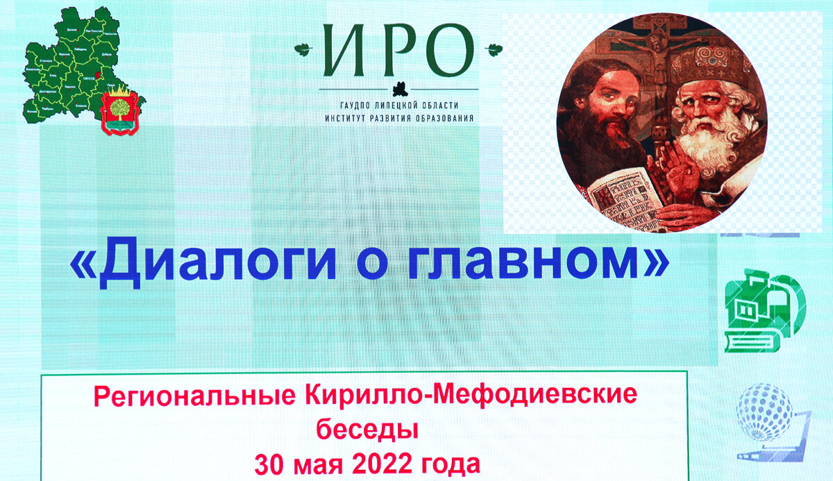 30 мая 2022 года на базе Государственного автономного учреждения дополнительного профессионального образования «Института развития образования Липецкой области» прошли Региональные Кирилло-Мефодиевские беседы «Диалоги о главном». Мероприятие организовано и проведено сотрудниками института совместно с представителями Липецкой митрополии, Управления образования и науки Липецкой области, Управления внутренней политики Липецкой области, Липецким региональным отделением общероссийской общественной организации «Ассоциация учителей литературы и русского языка», Координационным советом учителей ОРКСЭ и ОДНКНР Липецкой области. Слушателями чтений выступили преподаватели образовательных учреждений региона, священнослужители и студенты направления «Теология» Липецкого государственного педагогического университета им. П.П. Семенова-Тян-Шанского. В начале мероприятия собравшихся приветствовали: ректор «Института развития образования Липецкой области», кандидат педагогических наук Инесса Анатольевна