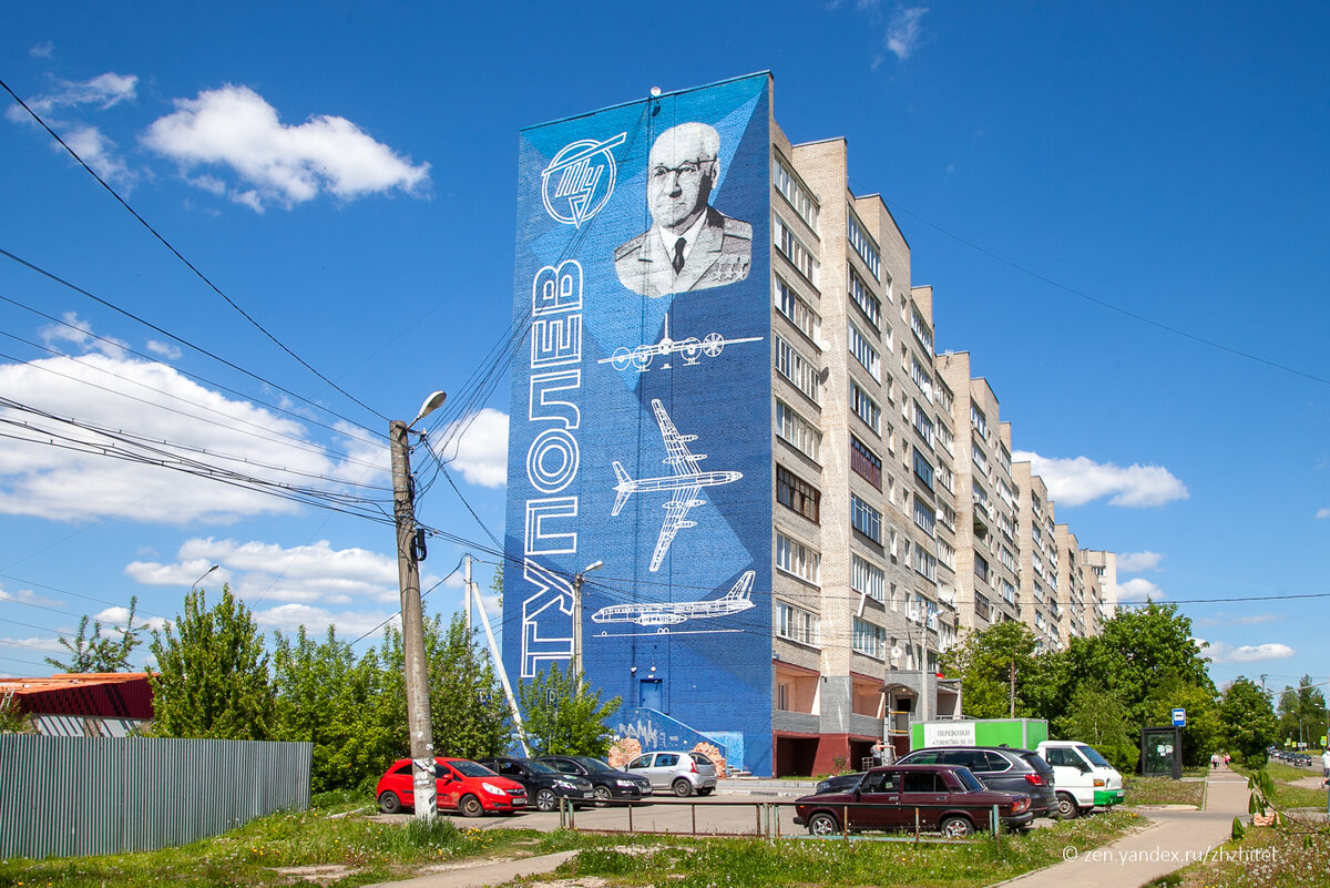 Мне нравится, когда безликие торцы домов расписывают красками, изображая различные сюжеты. Это один из видов уличного искусства — граффити, точнее его подвид — муралы. Всегда обращаю внимание на них. Один из лучших образцов настенной живописи находится в Домодедово в микрорайоне Авиационный. Каждый раз, проезжая мимо, я любуюсь этой картиной высотой во всю стену девятиэтажного дома. Портрет Андрея Николаевича Туполева украшает здание не просто так, это проспект Академика Туполева. Изображение одновременно выглядит и строго, и современно. Синий фон очень здорово сочетается с небом в погожий день, а в хмурую погоду выделяется на фоне туч. Туполев разработал множество военных и гражданских самолетов. Среди них стратегический бомбардировщик Ту-4, первый советский реактивный бомбардировщик Ту-12, турбовинтовой стратегический бомбардировщик Ту-95, дальний ракетоносец-бомбардировщик Ту-16, сверхзвуковой бомбардировщик Ту-22; первый реактивный пассажирский самолет Ту-104, межконтинентальный па