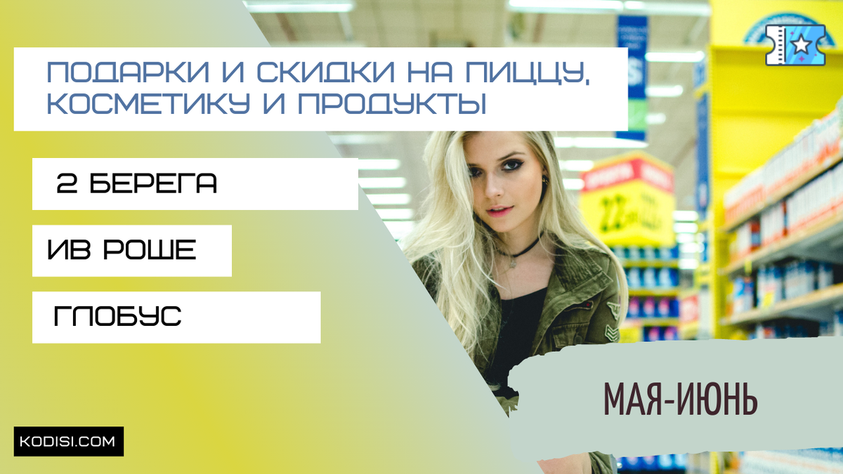 2 Берега, Ив Роше, Глобус. Все покупки будут сопровождаться или подарками, или хорошими скидками по промокоду. 💡 Главное помнить, что выгодно это будет только тем, кто итак планировал сделать подобный заказ! 1) Скидка на заказ пиццы с магазина 2 Берега Необходимо 💳 Сделать заказ любых 5-ти пицц без скидки. Не участвует Римская пицца! Что получите 🎁 Скидку 50% на весь заказ 2) Подарки и скидки за покупку любой косметики в Ив Роше Необходимо 💳 Сделать заказ любой необходимой косметики на сумму 2 000 рублей. Что получите 🎁 Подарок (❔) и скидку 10% по промокоду. 🎫 Промокод: Admitad10 3) Скидка на покупку продуктов в магазине Глобус Необходимо 💳 Сделать любой заказ продуктов на сумму от 5 000 рублей. Кроме электроники, бытовой техники и акционных товаров Что получите 🎁 Скидку 15% по промокоду. 🎫 Промокод: VL15 Ждем всех, кто хочет получать подарки за повседневные заказы, в нашем сервисе Kodisi.com