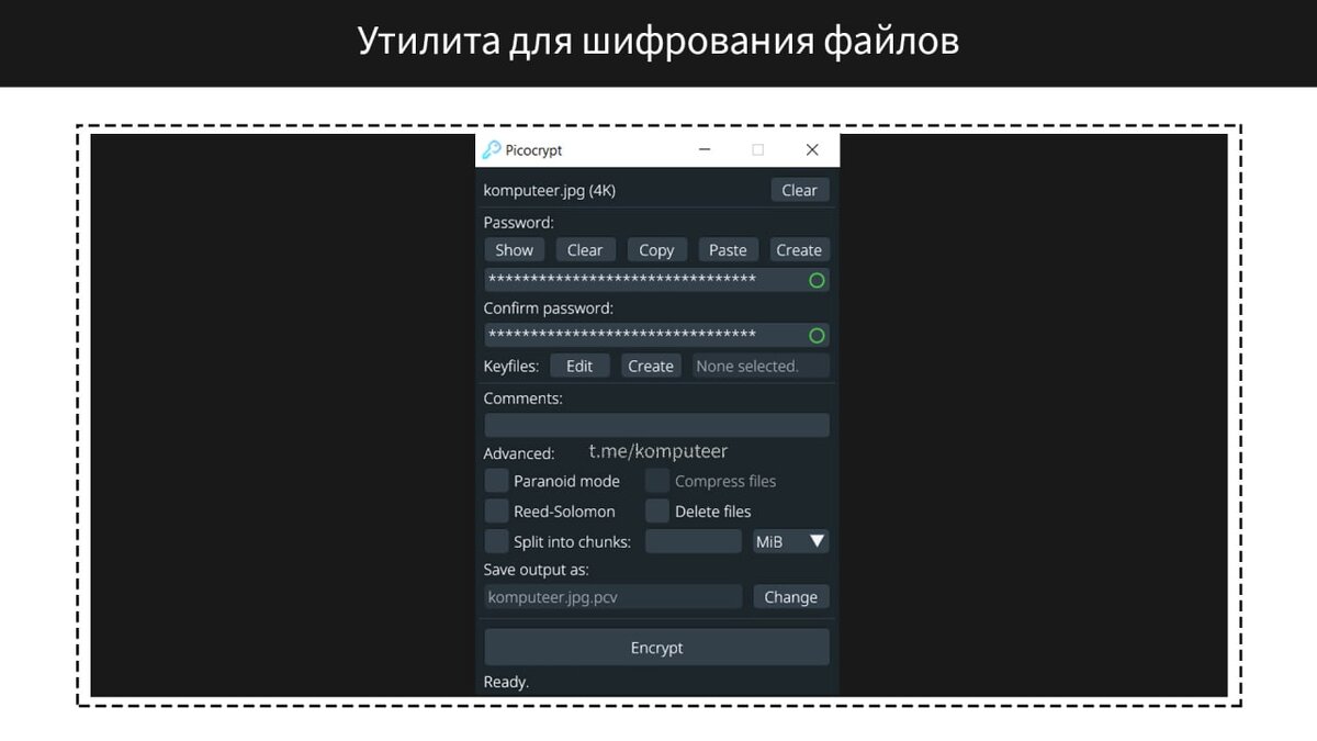 Утилита для шифрования файлов Picocrypt — это небольшой и простой в использовании инструмент для шифрования файлов. Утилита умеет не только шифровать, но и генерировать надежные пароли и редактировать метаданные файлов. Если хочется, можно эти метаданные даже полностью удалить. Программа предлагает простой метод перетаскивания. Просто запустите программу и перетащите необходимые файлы в окно Picocrypt. После выбора файла можете изменить настройки шифрования и нажать "Encrypt". Зашифрованные файлы переименовываются, и к их именам добавляется расширение PCV. Зашифрованные файлы можно расшифровать тем же способом. Для этого запустите Picocrypt, перетащите в окно зашифрованные файлы, введите пароль и нажмите кнопку "Start". #лайфхак #безопастность #шифрование