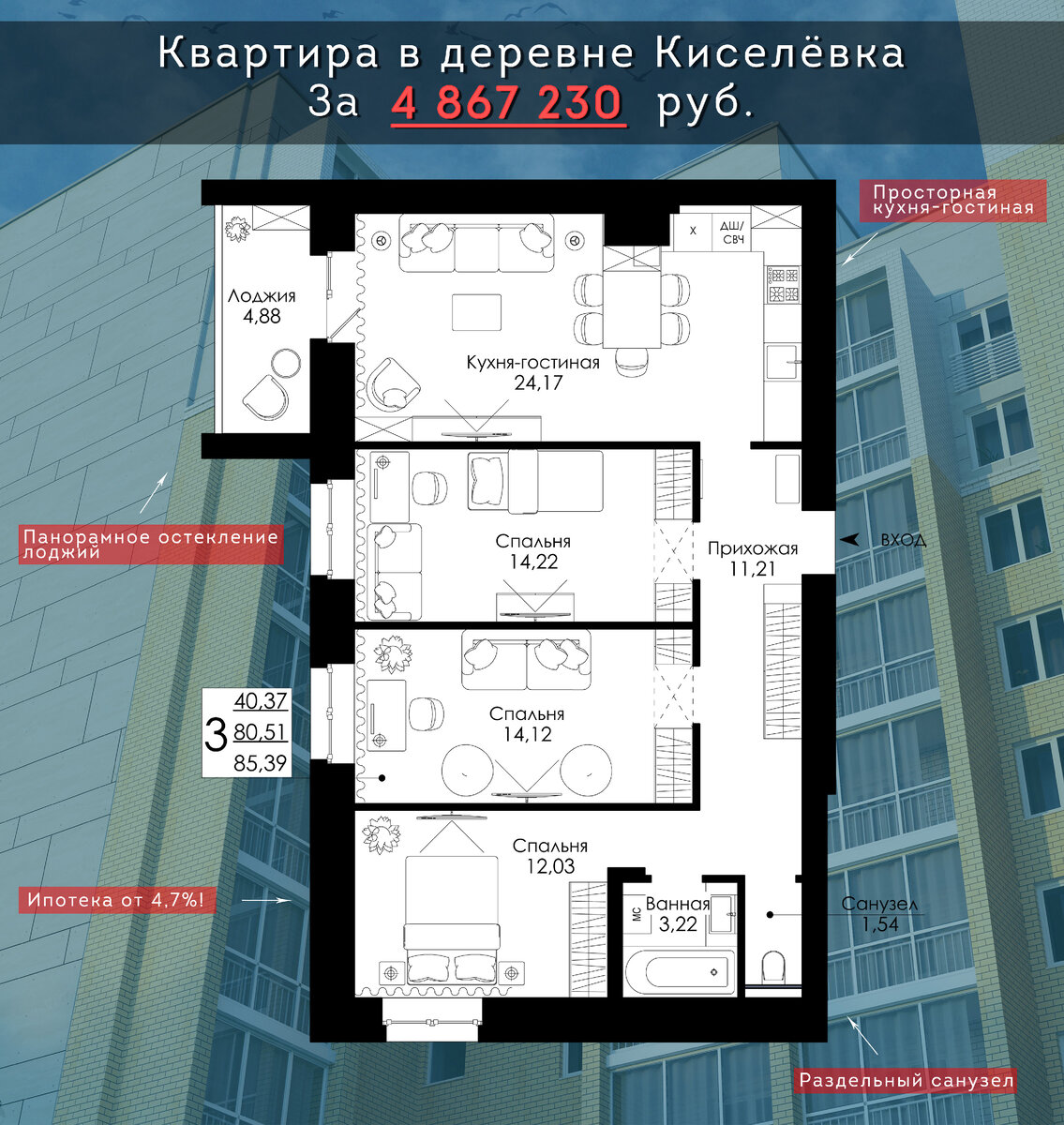 Каждому по комнате! Три комнаты и большая кухня-гостинная! Лучший выбор для большой семьи!!!