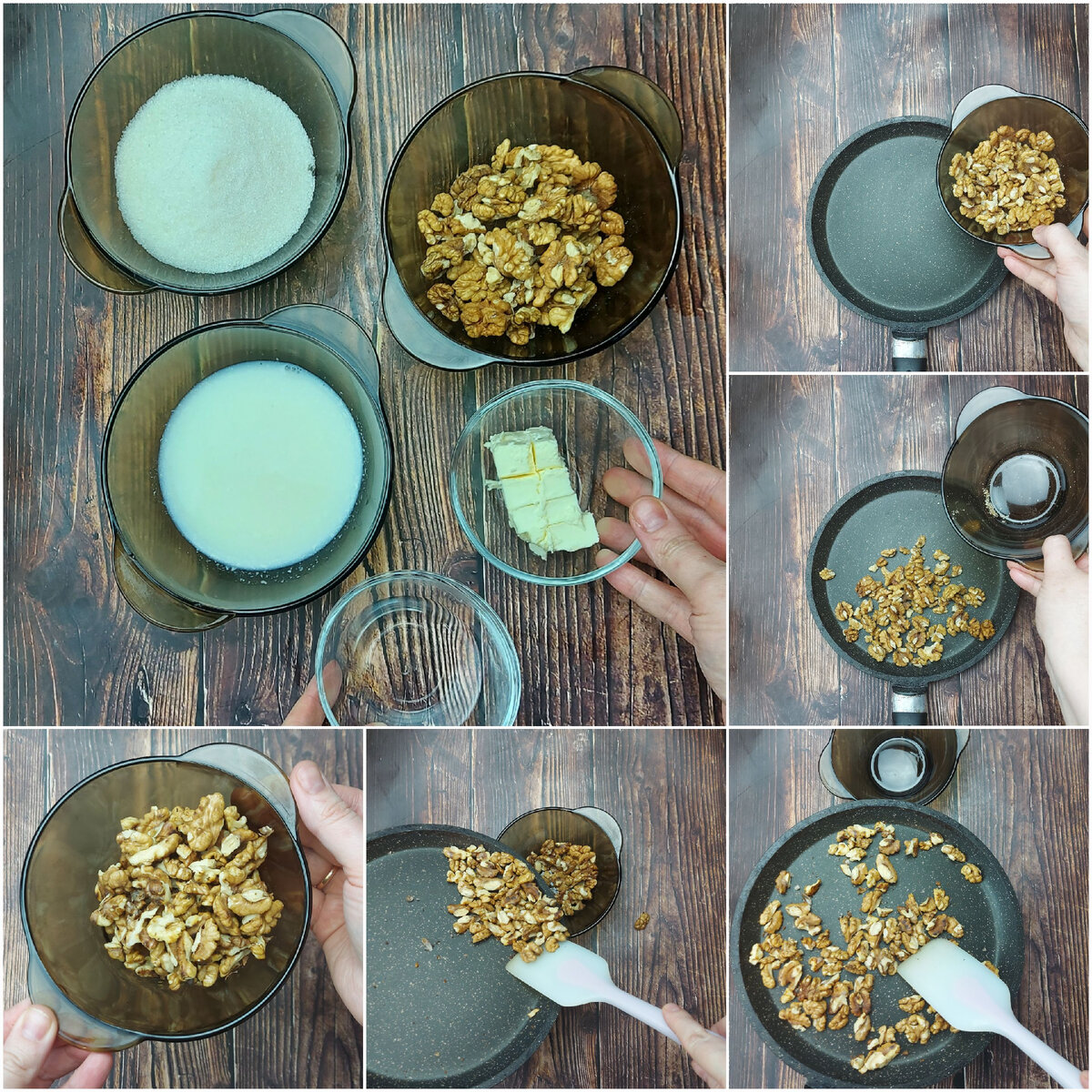 Бюджетный вариант Главное в рецепте этого десерта- хорошо уварить сахар, для чего и нужна толстостенная кастрюля. Пробовала много раз... то засахаривается, то постоянно влажной кистью снимать сахар со стенок нужно... подробный рецепт. Состав: Молоко- 100мл. Сахар-150гр. Вода-30мл. Сливочное масло- 50гр. Орехи- 70-80гр. 1️⃣Орехи слегка обжариваем. 2️⃣В сковороду наливаю воду и всыпаю сахар. Сахар не размешиваем- можно немного придавить лопаткой, чтобы он стал влажным. Ставим на огонь и варим сироп. Ориентируемся на карамельный цвет. Про кастрюлю... У меня нет антипригарной кастрюли или ковша, поэтому когда готовила карамель в обычной толстостенной кастрюле приходилось постоянно снимать кистью кристаллами сахара. Попробовала приготовить в антипригарной сковороде ВОК- просто песня. Мешать- не надо, смачивать - не надо, сахар по краям не образуется. Очень удобно! 3️⃣Сироп не перемешиваем, но можно слегка покачивать сковороду, чтобы сахар расплавлялся равномерно. Таким способом удобно след