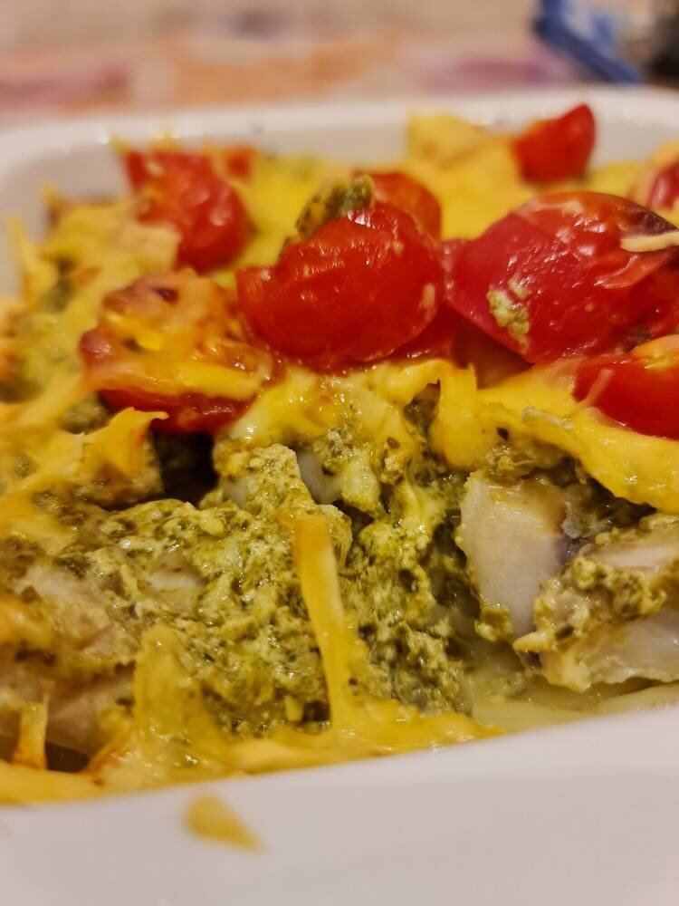 Рецепт подсмотрен на норвежском сайте магазина Rema 1000..поэтому имейте ввиду, что треска треске рознь..🤭 Ингредиенты: пасты (фарфалле, конкилье или подобные), трески, черри (медовые), пармезана или сыр на выбор, оливкового масла, соуса песто, сметаны/мацони Способ приготовления: Подготовить продукты. Если правильной пасты не оказалось в нужном количестве, как у меня 🤭 возьмите спагетти. После приготовления нарежьте их ножницами, но больше никогда так не делайте😁. Отварить пасту в подсоленной воде аль денте. Тем временем сделайте соус. Для чего смешайте песто и сметану/мацони. Мацони берут те, кто придерживается диеты, как я 😝. В керамическую форму наливаем оливковое масло. Выкладываем пасту. Перемешиваем с оливковым маслом. Выкладываем предварительно подсоленную треску кусочками. Заливаем соусом. Выкладываем черри. Посыпаем тёртым сыром. Духовку разогреть до 200 градусов. Запекать 20 минут, затем убавить до 100 градусов и запекать ещё 10 минут. Готовое блюдо посыпать свежим базил