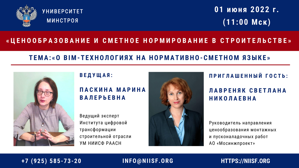 1 июня 2022 года состоится интервью- беседа с руководителем направления ценообразования монтажных и пусконаладочных работ АО «Мосинжпроект» Светланой Николаевной Лавреняк и сотрудниками ее отдела по теме: «О ВIM-технологиях на нормативно-сметном языке». Ведущая вебинара: Паскина Марина Валерьевна - Ведущий эксперт Института цифровой трансформации строительной отрасли УМ НИИСФ РААСН В ходе беседы они поделятся с нами ответами на вопросы: Что такое ВIM в сметном деле? Какая ценность применения ВIM профессионально важна сметчикам? Как меняется функционал работы сметного отдела с внедрением ВIM? Какие проблемные моменты стоит учитывать в переходный период? В чем реально помогает сметчику ВIM при составлении сметной документации? Есть ли «набитые шишки»? Как быть сейчас с импортозамещением? Какие итоги работы сметчиков с ВIM есть на практике? На прошлой н