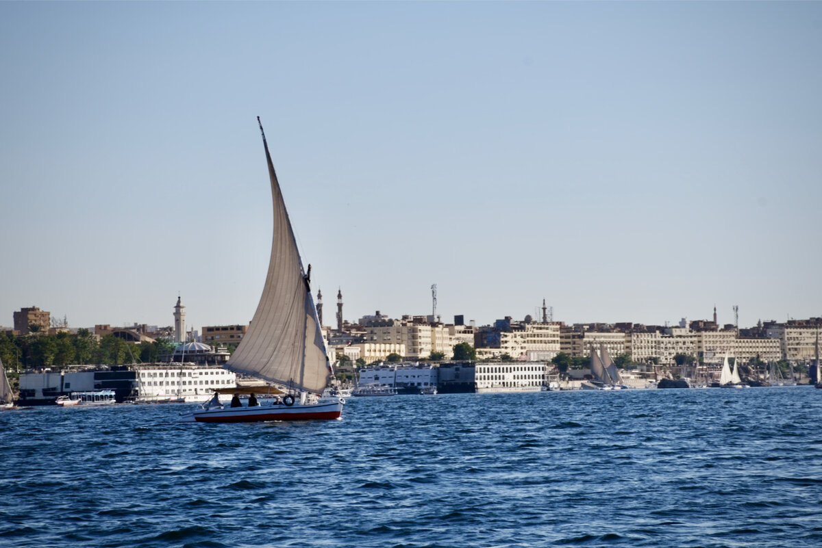 Нил, главная водная артерия Африки, до недавнего времени считался самой длинной рекой в мире. Сейчас пальму первенства отдали Амазонке, хотя не удивлюсь, если спустя несколько лет будет обнаружен ещё какой-нибудь новый факт, и мнение опять изменится. Нил образуется двумя истоками - Белым и Голубым Нилом. Белый Нил берет начало в озере Виктория. Белым его называют из-за белого глиняного стока с реки Сорбат. Голубой Нил вытекает из озера Тана в Эфиопии. Они встречаются в центре Судана, городе Хартум, и дальше несут свои воды в Средиземное море. Кстати, большинство рек мира текут с севера на юг. Нил в этом плане исключение, он течёт с юга на север. Он широкий - расстояние между берегами колеблется от 350 метров до 7,5 км, но неглубокий - максимум 11 метров. Очень удивило, что в Асуане Нил чистый. Если в Каире было страшно отпускать руку в воду, то тут в принципе предложение искупаться не вызвало у нас испуга. Но было холодно, поэтому купания в Ниле у нас не случилось. А ещё в районе Асуан