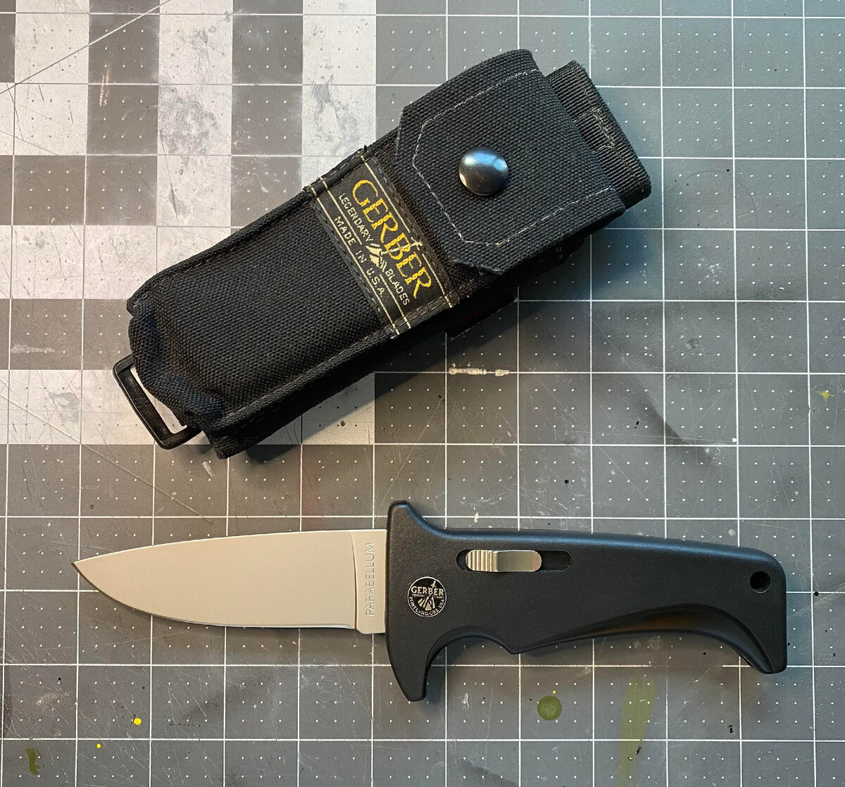 В прошлом столетии вначале 80-х, фирма Гербер выпускала довольно интересный нож под названием Parabellum. Здоровенный, крепкий складной нож, немного черствый конечно, зато надежный. Модель отлично себя зарекомендовала и даже была доступна для частной покупки отрядам Национальной Гвардии США. В 1987 году модель была удостоена премии в номинации: “ Нож года американского производсва”. На тот момент нож был оборудован современным замком типа Bolt Action Lock. Эту систему для фирмы Гербер спроектировал Уолтер Коллинз. Работа замка довольно проста, внутренняя ось за счет действия пружины при открывании клинка входит в паз на пяте и давит на нее под воздействием пружины. Это обеспечивает надежное крепление лезвия, выдерживающее значительное давление на обух. Складывается нож просто, достаточно оттянуть рычаг на плашке рукояти.Таким образом, клинок остается, зафиксирован в любом положении. Интерес представляют и ножны. Как я понял версия, которая рассчитана для военных предполагает двойно