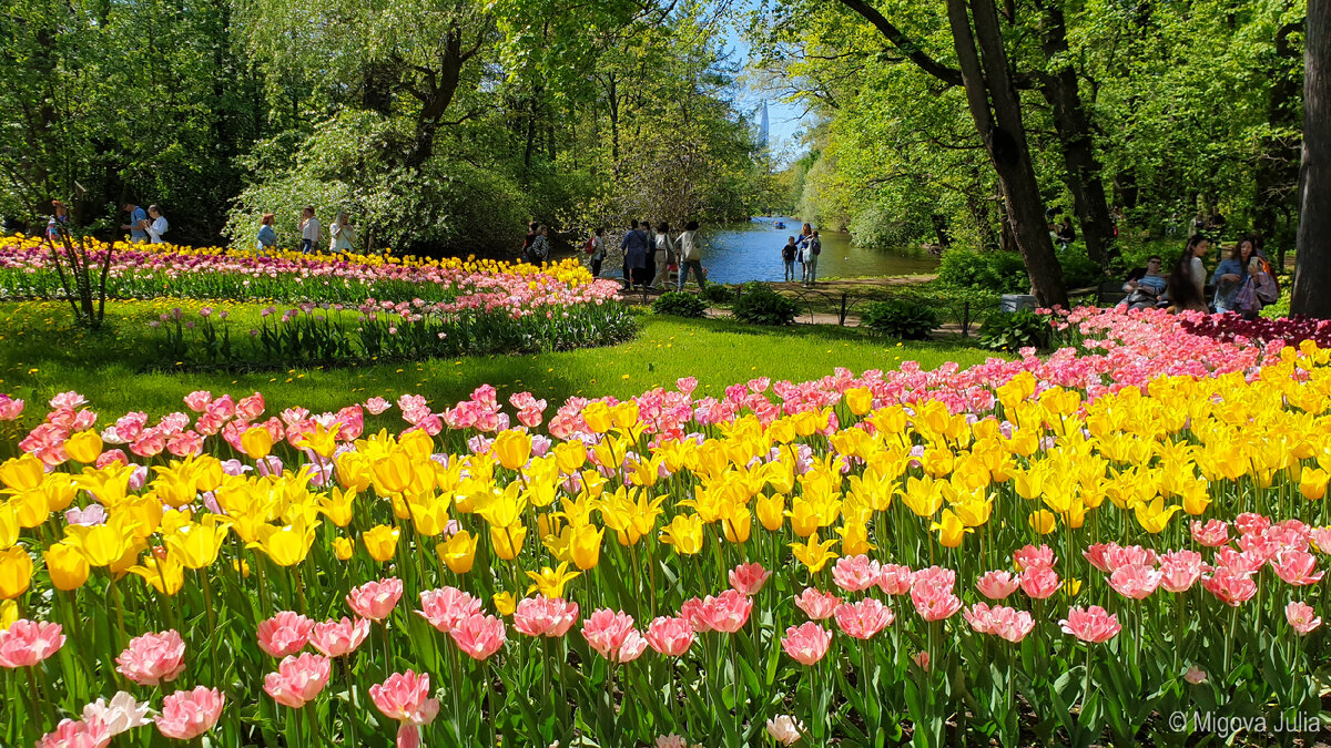 Будний день рабочее время, а в парке на Елагином острове не протолкнуться. А все потому, что в Питер пришло долгожданное тепло и открылся фестиваль тюльпанов. По всему парку встречаются разноцветные маленькие цветочные островки и огромные клумбы с тюльпанами. Тюльпаны самых разных сортов и расцветок. Некоторые уже отцветают, другие только собираются распуститься. Аромат на аллеях парка стоит совершенно волшебный. Белки по-прежнему дружелюбны и гостеприимны, хотя сейчас основное внимание приковано не к ним. Мечтаю отправиться весной в парк Кёкенхоф в Нидерландах и сравнить впечатления. А пока очень рекомендую фестиваль тюльпанов в парке на Елагином острове.