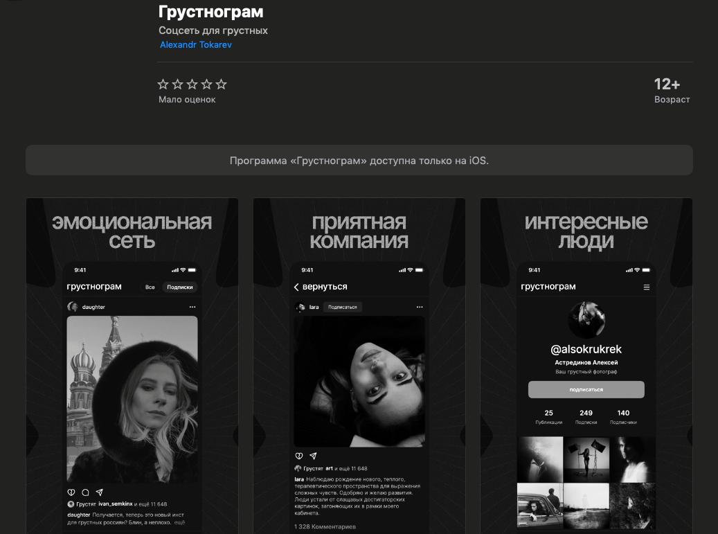 В период активного исхода наших сограждан из Инстаграм группа творческих человеков взяли и создали «свой инстаграм», для того чтоб там грустить. В черно-белой идеологии. Поначалу там и правда бОльшая часть пользователей публиковала грустноватые фото, стихи, тексты, и... котиков. Но в данный момент это полноценная площадка для публикации фото и коротких видео. Причем по идеологии похожая на Инстаграм в среднем его периоде: на 1 публикацию только 1 фото, ни каких сториз (надеюсь они там и не появится), агрессивного алгоритма выдачи, директов, рилсов и прочего. До последнего времени и тегов не было - но сейчас есть, и работают как когда-то в ИГ.