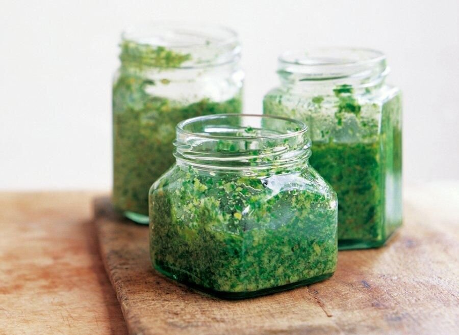 Начал ли поспевать урожай у вас на даче? У самых умелых уже пошли огурчики, ну а зеленюшка так уже и у всех на подходе! Поэтому самое время вспомнить про то, что из петрушки получается потрясающий песто — итальянский соус из измельченной зелени, орешков и сыра. Обычно все слышали про песто из базилика, но на самом деле, делать его можно из любой зелени с насыщенным вкусом. И с петрушкой он получается ну просто пальчики оближешь! 2 стакана листьев петрушки 1 стакан чищенных грецких орехов 0,5 стакана тертого сыра пармезан 0,5 стакана оливкового масла 3 зубчика чеснока 0,5 чайной ложки соли Орехи мелем в блендере до состояния каши. Теперь также блендером мелем петрушку, потом то же самое проделываем с чесноком. Потом смешиваем и добавляем к ним масло, соль, сыр. Песто готов. Теперь нужно его переложить в баночку и тут же можно начинать его использовать. Хранить его можно в холодильнике около 2 недель, Используйте как соус к спагетти, добавляйте в салаты — это очень вкусно. А еще