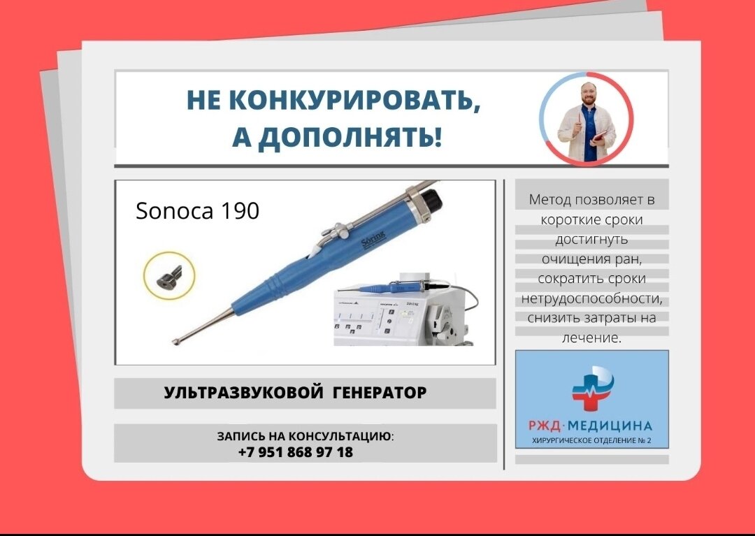 Не конкурировать, а дополнять! Так бы я в 2-х словах сказал обо всем оборудании и аппаратах, незаменимых помощниках хирурга. Сегодня в центре внимания ультразвуковой генератор для проведения ультразвуковой кавитация - Sonoca 190. Лечение хирургических инфекций кожи и мягких тканей одна из актуальных проблем хирургии. Длительное течение, частые рецидивы, утрата трудоспособности, снижение качества жизни… Sonoca 190 - это оборудование генерирует электрические колебания с ультразвуковой частотой, которые преобразуются пьезостриктивным преобразователем, расположенным в наконечнике, в возвратно-поступательные движения титанового волновода с частотой ультразвуковых колебаний системы. Во! 😎 А теперь проще: Sonoca 190 – аппарат для лечения ран, а именно лечение ран ультразвуковой кавитацией. То есть физическое воздействие на рану. В приборе возникают определенные процессы частотой 25, 35 и 55 кГц, которые приводят к разрушению и механическому удалению бактерий, очищению ран от некротич
