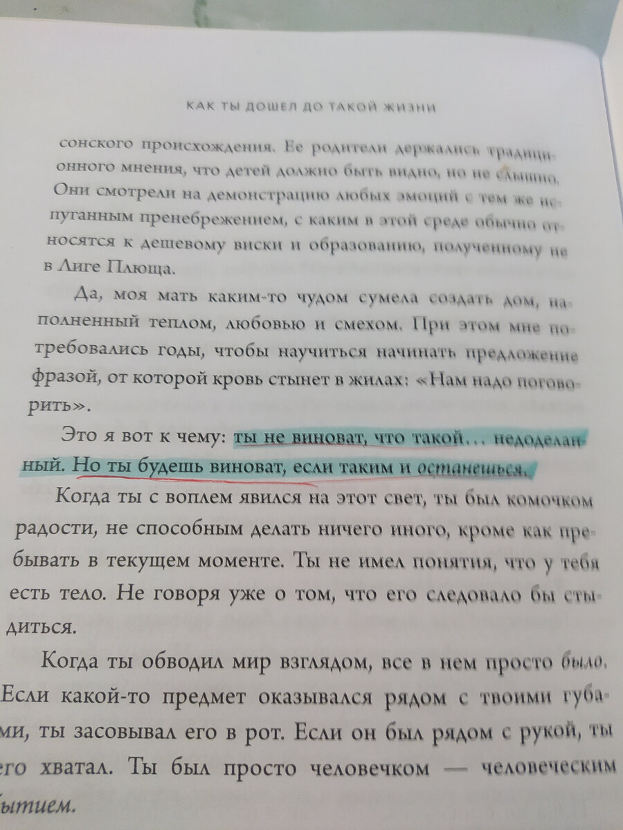 Я для себя эту фразу преобразовал в: "Ты не виноват, что ты такой, какой есть, себе не нравишься. Но ты будешь виноват, если не попытаешься либо полюбить себя таким, как есть. Либо - стать таким человеком, который будет вызывать в тебе позитив.". Вот, давайте любить себя и мир вокруг.