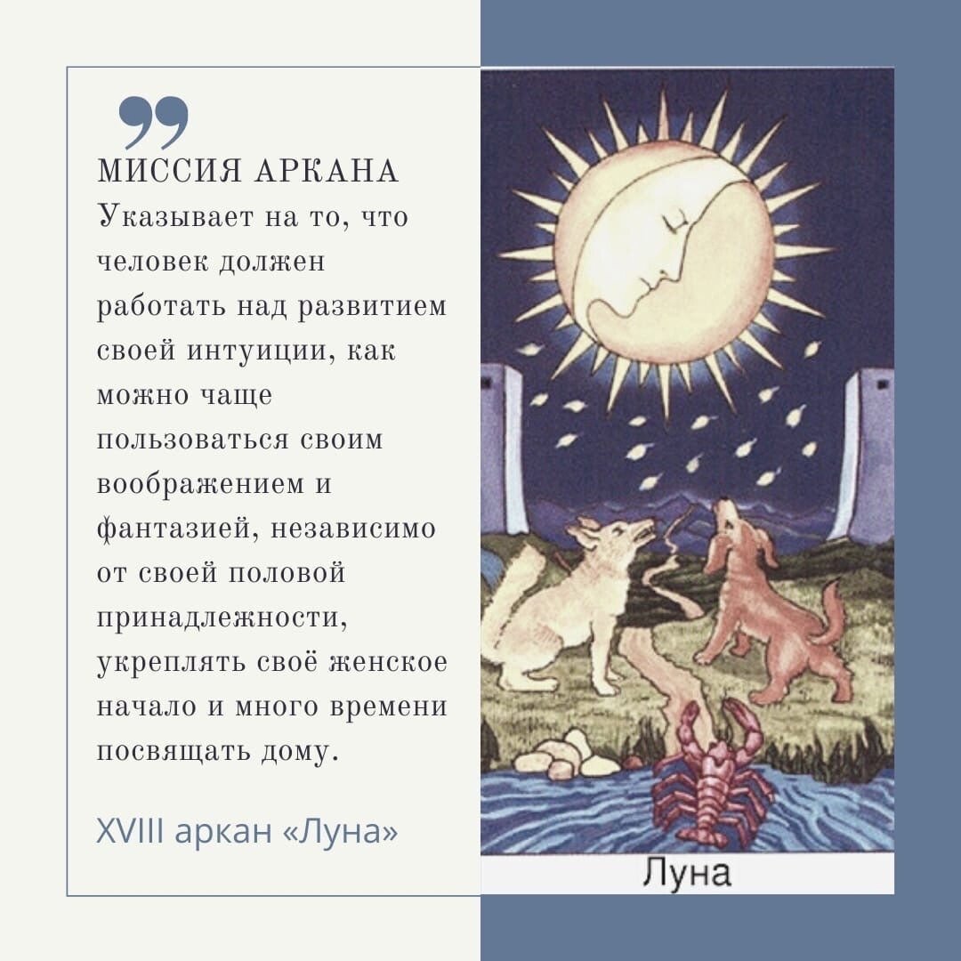 МИССИЯ АРКАНА Указывает на то, что человек должен работать над развитием своей интуиции, как можно чаще пользоваться своим воображением и фантазией, независимо от своей половой принадлежности, укреплять своё женское начало и много времени посвящать дому. 👍ПЛЮСЫ АРКАНА Зов Луны. Интуиция. Сильные эмоции. Скрытые истины Неординарные способности. Воображение. Фантазии. Потусторонний мир. Творческий потенциал подсознания. Литературное творчество. Актерство. Работа, связанная с иллюзиями. Индустрия развлечений. Дикая природа. Первозданность. Путешествия. 🤰🏻ЛЮДИ: Мама; жена; любовница; человек, посвятивший себя дому, семье, работе или другим людям. 👎МИНУСЫ АРКАНА «Лунные фантазии». Бегство от действительности. Обман. Мошенничество. Неискренность. Клевета. Ложь. Предательство. Запутанные мысли. Неверность., Хитрость. Страх. Нервозность. Переполняющие эмоции. Тревожные образы. 👩⚕️ЛЮДИ: Мачеха; невротик; человек, особо чувствительный к себе; человек, не способный понять себя. 👨⚕️ПР