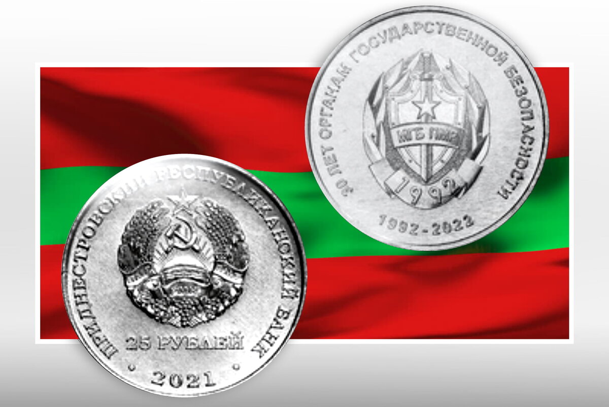 1 июня 2022 года в обращение вводятся памятные монеты из недрагоценных металлов достоинством 25 рублей «30 лет органам государственной безопасности ПМР» серии «Государственность Приднестровья». Аверс монет: в центре – изображение Государственного герба Приднестровской Молдавской Республики; по кругу – надписи: вверху– «ПРИДНЕСТРОВСКИЙ РЕСПУБЛИКАНСКИЙ БАНК», внизу – «2021»; в нижней части под гербом – номинал «25 РУБЛЕЙ».