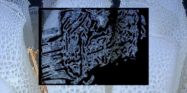 У скелета корзинки Венеры есть два выраженных геометрических мотива. Внутренний слой — однородная пористая сетка с квадратной ячейкой и диагональными связывающими элементами. Это прочная и даже немного гибкая структура. Они неплохо изучены, потому что скелеты хорошо сохраняются и их в распоряжении ученых немало.