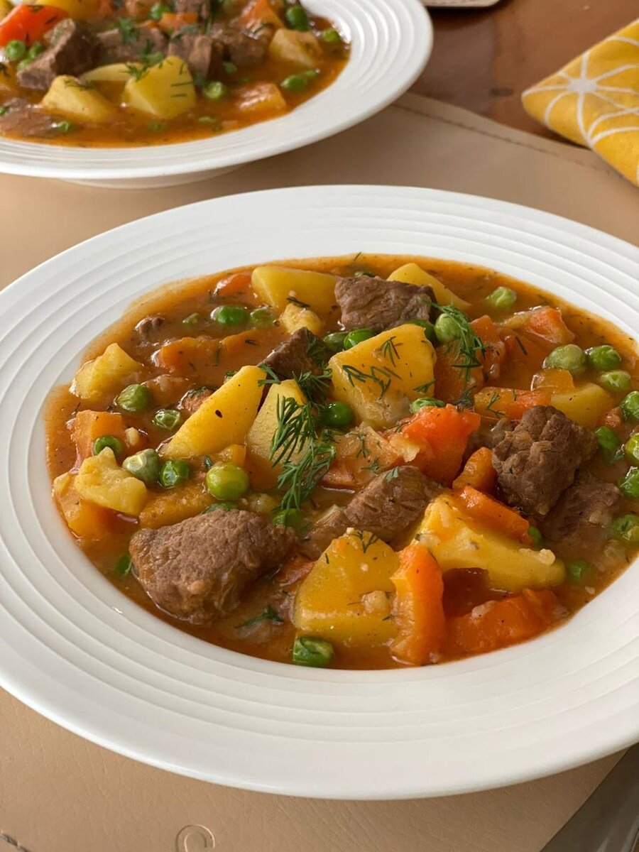 Очень вкусное и сытное блюдо. Мясо просто тает во рту, а какой соус! А если ещё хлебушком помакать, пальчики оближешь 🤤 Попробуйте обязательно! Весь секрет в долгом томлении говядины. Ингредиенты: 500-700 г говядины 1 кг картофеля 200 г зелёного горошка (замороженного) 1-2 луковицы 2 моркови 2 ст.л. муки 1 ст.л. томатной пасты 1 ч.л. тимьяна 1 ч.л. паприки 3 зубчика чеснока (у меня был сухой чеснок) Зелень Соль, перец Растительное масло ⠀ В сотейнике разогреть масло и обжарить кусочки говядины со всех сторон до красивого цвета. Посолить и поперчить. Выложить мясо на тарелку. ⠀ В этом же масле обжарить крупно нарезанные лук, морковь и измельчённый чеснок. Добавить говядину. ⠀ Высыпать муку, перемешать. Добавить томатную пасту, перемешать. Влить 1 л воды. Добавить все специи, тщательно перемешать, накрыть крышкой и тушить 1,5 часа на маленьком огне. ⠀ Картофель нарезать крупными кубиками и добавить в сотейник. Перемешать и ещё тушить под закрытой крышкой в течение 30-40 минут. ⠀ Затем