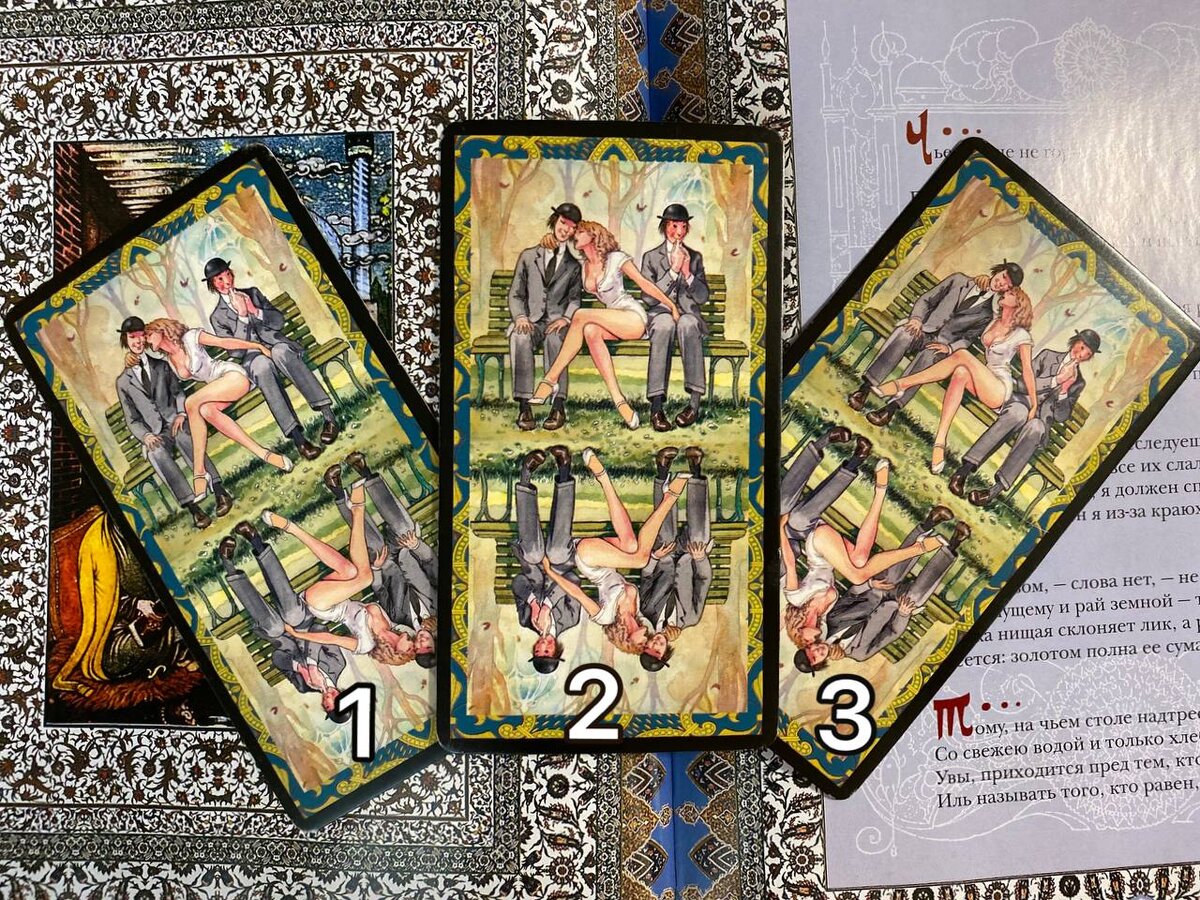 Думаю, будет не лишним дать вам ещё и описание эмоций на оставшуюся неделю. Для чего это нужно ? Зная примерно эмоциональное состояние предстоящих дней, можно ясно оценивать ситуации и не поддаваться бушующим страстям внутри себя. ВНИМАНИЕ, хочу заметить, что данные расклады носят обобщенный характер, поэтому и являются общими для всех. В ним нет мелких детальней, которые обычно рассказывают тарологи на индивидуальных сеансах. Поэтому, если вам интересно узнать что-то на более интимном уровне смело пишите в мой тг канал 👇🏼(индивидуальные расклады/ обучение таро) Правила: выбираете одну из карт на фото, где карты изображены рубашкой вверх.После смотрите следующее фото, где карты уже перевёрнуты ( считаем карты слева - направо 1,2,3) в комментарии к статье можете указать какую карту выбрали или по окончанию недели проигрался ли расклад у вас. 1. Шестёрка огня - карты двоякая, поскольку на ней изображены двое ( роли на карте определяются не по принадлежности к полу. Во многих раскла