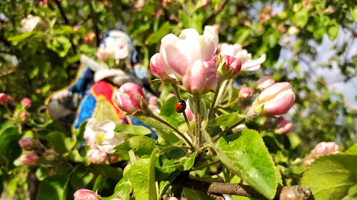 Она ползла вверх, к цветочку. Или к небу? Я фотографировала ангела, но она, хоть и крохотная, но яркая, перетянула внимание на себя. "Вот он - главный секрет стиля!" - подумала я и замечтала двуцветное. Тем временем ангел, обнимая цветок, беспечно ничего не ждал - всë, что должно, обязательно случится - как весна. Начало цветения яблони очень знаковый момент для меня. Пропустить нельзя. Ни разу не случалось. Волшебство превращения розовых бутонов с тонкими красными прожилками (кровь жизни?) в белоснежные цветочки - главное чудо весны и обещание вышивального вдохновения. Лоскутная осыпь лепестков на зелëном и чëрном - эскиз. Вот он, цветочек. Вот она, ветвь. Не похоже? А я и не копировала, я создавала. Ангел хранитель нашел идеальный фон - горчичный лишайник, фактурный, яркий. Сидит на веточке, слушает мои планы, на катушечку идеи наматывает, обещает всë исполнить. На катушку намотать бы листок осоки, длинный и жëсткий. Намотать бы паутину, шелковистую и бесконечную. Намот