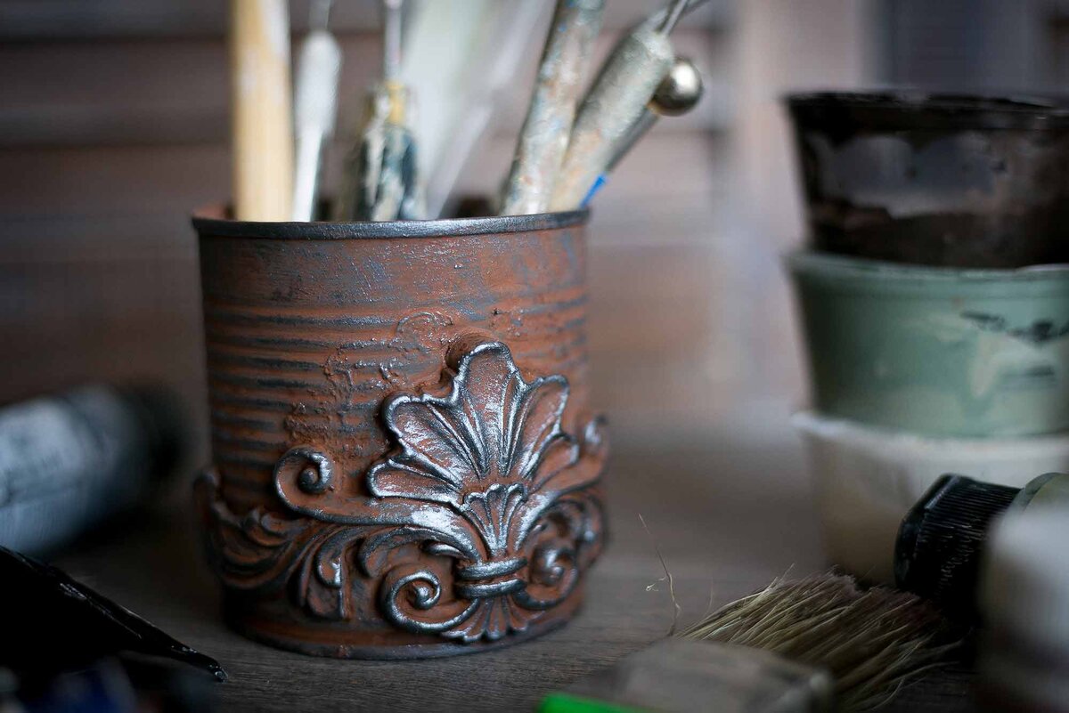 На примере декора консервной баночки хочу показать вам как можно быстро и просто окрасить рельеф под металл. Это окрашивание подойдет для любого рельефа: готовой формы (статуэтки или гипсовой рамки), для элементов из самозатвердевающей массы или древесной пульпы, а также для трафаретных орнаментов. Я приклеила элемент из самозатвердевающей массы к консервной банке с помощью клея Момент монтаж Жидкие гвозди и оставила до полного высыхания. Покрыла баночку алкидным грунтом из баллончика. Теперь можно приступать к окрашиванию. Сначала наношу серую краску (белая + черная в соотношении 1:1) После высыхания серой краски, я беру акриловую краску с оттенком ржавчины (это может быть сиена жженая, охра красная или оранжевый + коричневый), разбавляю её водой и наношу на поверхность. Краска должна быть достаточно жидкой, чтобы она затекала в углубления. При необходимости помогаю себе пульверизатором. Оставляем сохнуть естественным путем или подсушиваем феном (не сильный напор, иначе вся краска "у