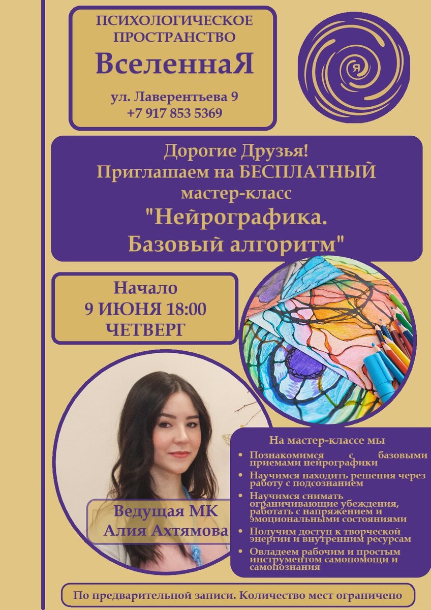 Вход СВОБОДНЫЙ Дорогие друзья! 🌟 Приглашаем на мастер-класс по рисованию нейрографики 🔥 «НЕЙРОГРАФИКА. БАЗОВЫЙ АЛГОРИТМ» ✍️ Для всех желающих ВХОД СВОБОДНЫЙ 🗓 МК состоится: 9 июня в четверг, в 18:00 ПП "ВселеннаЯ" Адрес ул. Лаврентьева, 9 👩🏫 Нейрографика это уникальный молодой арт-трапевтический метод работы с подсознанием. ⚡️Основа метода это работа через рисунок, который мы создаем сами по определенным алгоритмам и предварительно формируя некое намерение, задачу над которой хотим поработать. 💫 Благодаря работе с нейрографикой можно наладить коммуникации между личностью и окружающим миром, справиться со стрессом, снять внутренние ограничения. 🙌 Метод отлично подходит для работы с различными эмоционлаьными состояними, страхами, тревогой. Помогает развивать осознанность, способность слышать себя и свои потребности. 💃 И, конечно, метод творческий, энергоемкий и ресурсный. 🎨 Рисуя нейрографику мы высвобождаем застоявшуюся в нас творческую энергию, энергию эмоций, пер