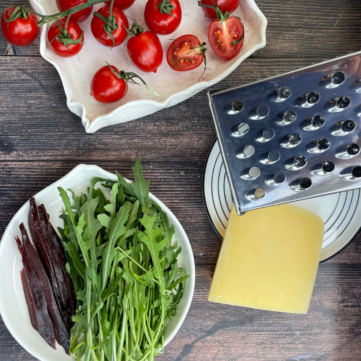 Ингредиенты: • Юккола - 100 гр • Руккола - 70 гр • Пармезан - 1 ст.л • Помидоры черри - 10 шт для заправки: • Сок лимона - 1 ст.л • Оливковое масло - 2 ст.л • Мед - 1/2 ч.л • Соль - на кончике ножа Шаг 1 Подготовьте все ингредиенты. Шаг 2 Рукколу вымыть, просушить. Разложить в большой тарелке. Шаг 3 Оленину порезать ломтиками. Положить сверху рукколы. Шаг 4 Разрезать помидоры пополам, выложить сверху оленины, посыпать пармезаном. Шаг 5 В чашке взбить вилкой лимонный сок с медом и солью, влить масло. Шаг 6 Полить салат заправкой, слегка перемешать и сразу подать к столу. Приятного аппетита!