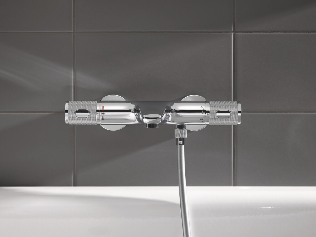 Лето уже наступило, а это означает, что впереди жаркие дни. В такое время нам хочется насладиться освежающим прохладным душем. Для того, чтобы получать от водных процедур только положительные эмоции, а не перепады температуры и риск ожога, создан термостат. Термостат - это залог стабильной температуры и напора воды. Благодаря специальному картриджу термостат выполняет функции, недоступные обычному смесителю. Если вы хотите получать максимум комфорта во время водных процедур, то советуем вам присмотреться к следующим моделям термостатов GROHE: 1. GROHE Grohtherm 1000 Performance Данный термостат разработан для максимального удобства и безопасности его пользователей. Технология CoolTouch исключает риск ожога о рукоятку, а рифлёное покрытие ProGrip позволяет регулировать температуру и напор без скольжения. И, конечно, помним об экологии! Специальная кнопка EcoButton позволит сократить расход воды до 50% одним нажатием. 2. GROHE Grohtherm Cube Кубический дизайн и точное выполнение заявленн