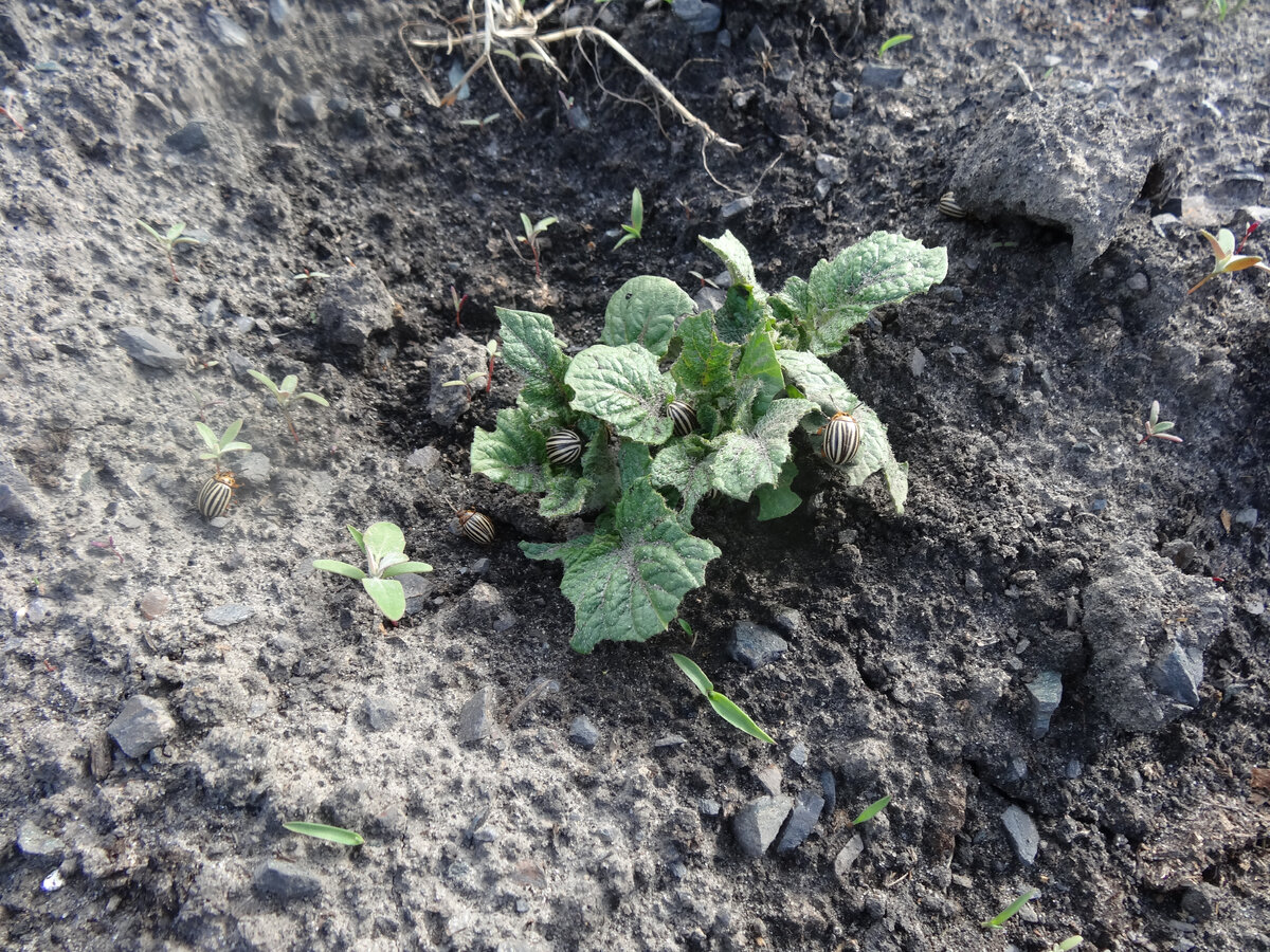 На следующий день отправилась на свой деревенский огород вызволять из неволи перцы, уже потерявшие надежду переехать из ящиков на подоконниках. Но начинать пришлось всё же не с них, а с борьбы с вредителями. В первую очередь, это колорадские жуки. Картофельные кустики едва только показываются на поверхности и тут же подвергаются атаке полосатой армии.