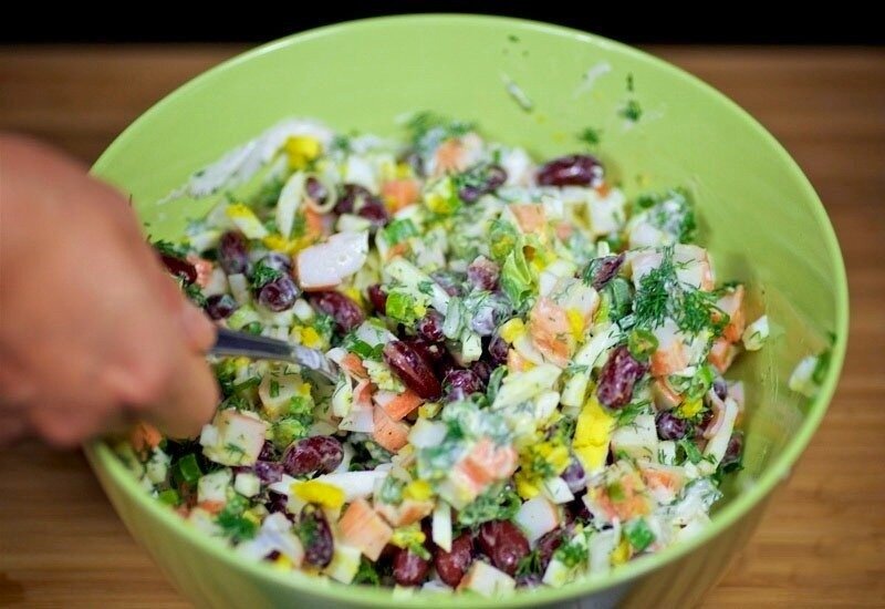 Что-то новенькое! Делюсь отличным рецептом салата с крабовыми палочками! Готовится просто, быстро, ингредиентов минимум и они все недорогие - в общем, все как мы любим. Когда обычный крабовый салат поднадоел - приготовьте этот. А чтобы не потерять рецепт, запишите его или поделитесь в соцсетях - и тогда он сохранится на вашей страничке. Впрочем, рецепт можно и запомнить - он очень простой. Приготовление: Нарезаем крабовые палочки кубиком или соломкой - как вам нравится. Добавляем красную консервированную фасоль (жидкость предварительно слить). Затем кладем вареные яйца, нарезанные кубиком. Это основа салата, которая как я и сказала, состоит всего из 3 ингредиентов. Можно оставить так. Но я советую добавить свежую зелень (укропчик и зеленый лук отлично подойдут). Добавляем соль по вкусу, можно немного поперчить. В качестве заправки берем сметану или майонез. Салат получается вкусный, очень сытный - всем, кто его пробовал у меня в гостях, очень понравился! Приготовьте и вы! Приятного апп