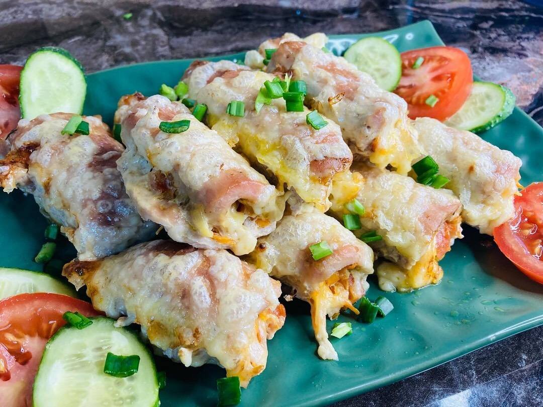 Ингредиенты: свинина для отбивных, лук , морковь , помидоры , сыр , соль, перец, специи Способ приготовления: Мясо нарезать, отбить, посолить, поперчить, добавить специи. Лук, морковь нарезать, натереть и обжарить на подсолнечном масле. Помидоры нарезать кубиками и добавить к луку с морковью. На отбивную положить начинку, кусочек сыра, свернуть в рулет и закрепить зубочисткой. Сложить рулетики в форму; налить немного воды и запекать в духовке на 190°С 40-50 минут. За минут 15 до конца приготовления посыпать тёртым сыром и запечь. ✅Приятного всем аппетита!