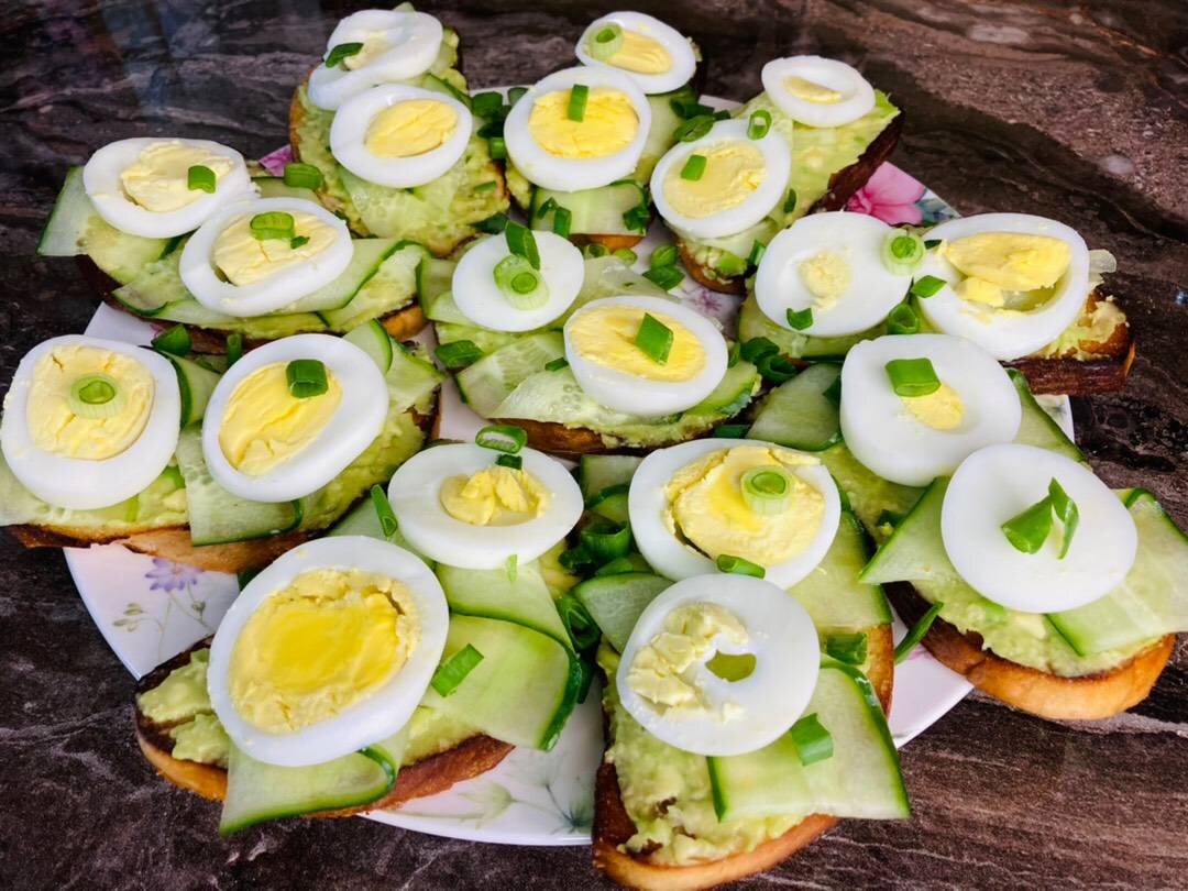 Ингредиенты: 🍞Батон, 🥑Авокадо, 🧄Чеснока , 🥒Огурец , 🥚Яйца Способ приготовления: ✅Батон обжарить с обеих сторон до золотистой корочки. ✅Авокадо разрезать, удалить косточку, достать мякоть в тарелку и размять вилкой до однородной массы. В авокадо добавить пару зубчиков чеснока (выдавить через пресс),чуть-чуть соли. ✅Яйца сварить, очистить и нарезать на кружки. ✅Огурец нарезать на тонкие слайсы. 😋Далее формируем бутерброды 🥪 полученную массу из авокадо намазать на обжаренный батон, положить слайсы из огурца и нарезанное яйцо. Верх присыпать зелёным луком. ❤️Бутерброды можно приготовить по разному, на свой вкус.